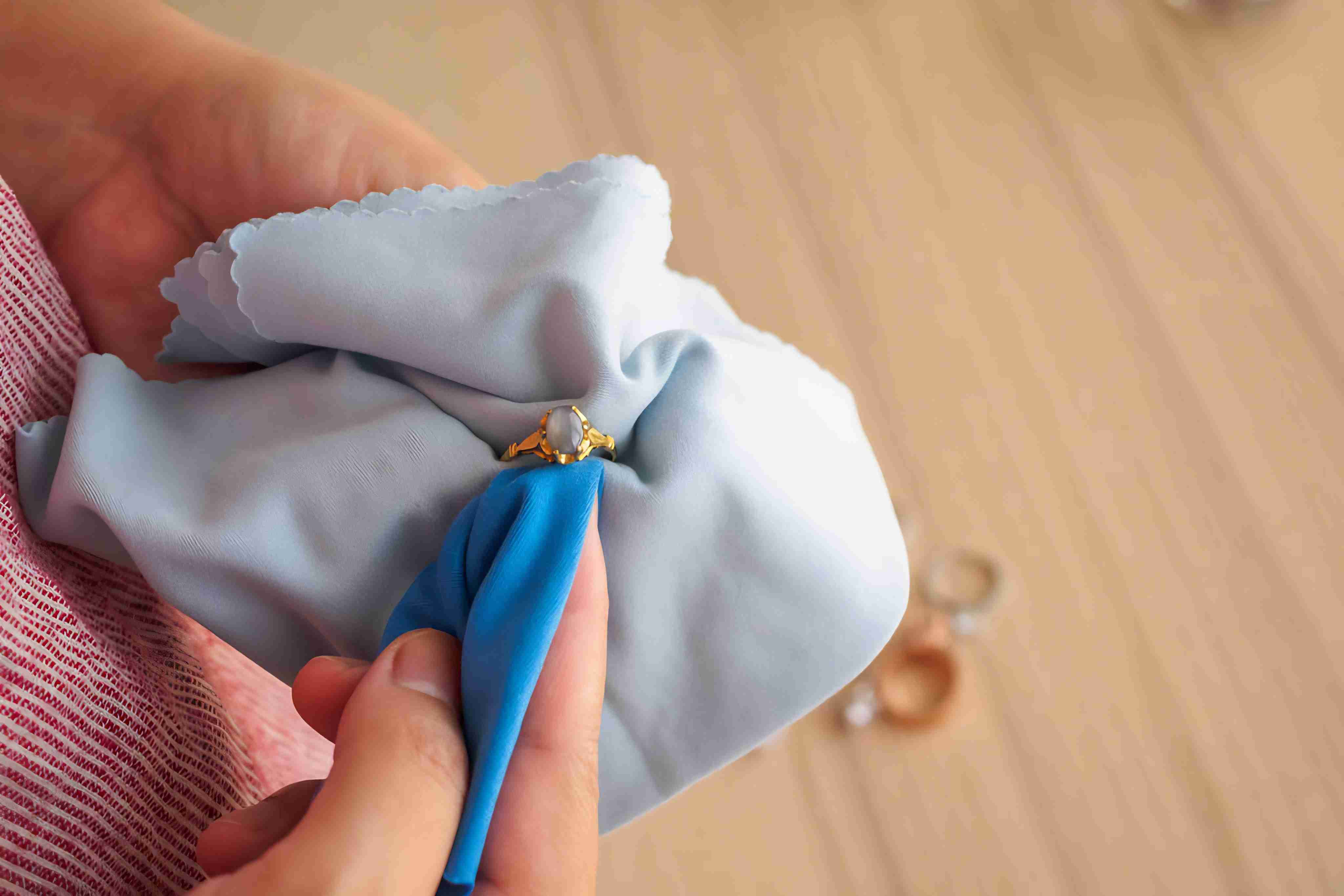 Jeweller hand polishing and cleaning gold jewelry ring with micro fiber fabric