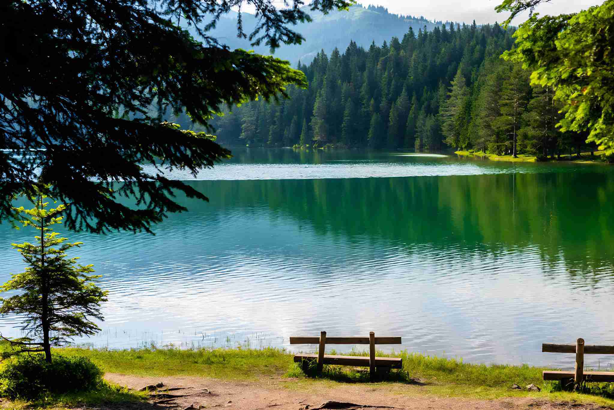 benches on coast of beautiful glacial Black Lake in Montenegro