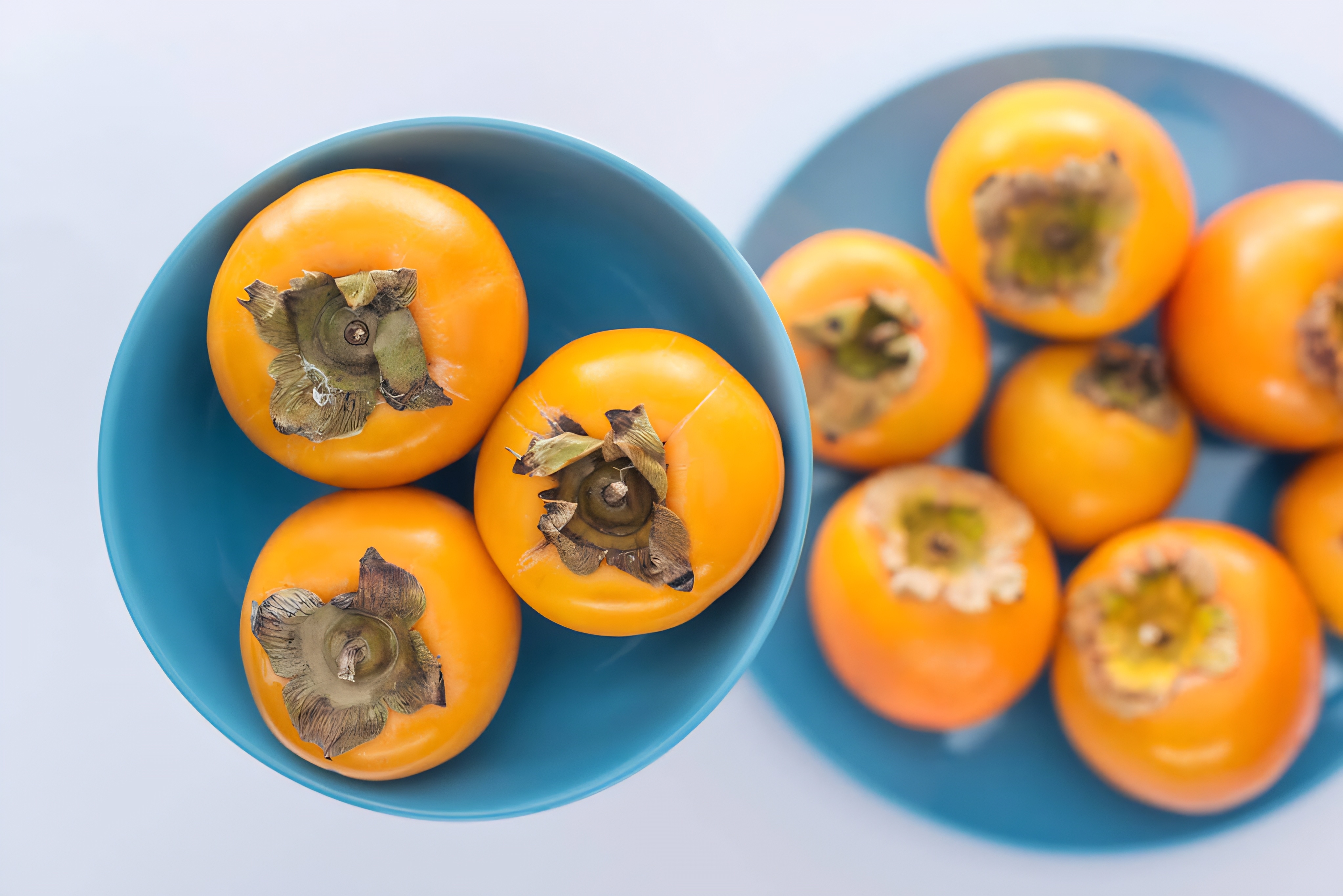将整柿子和甜柿子选择性聚焦在蓝色玻璃板上