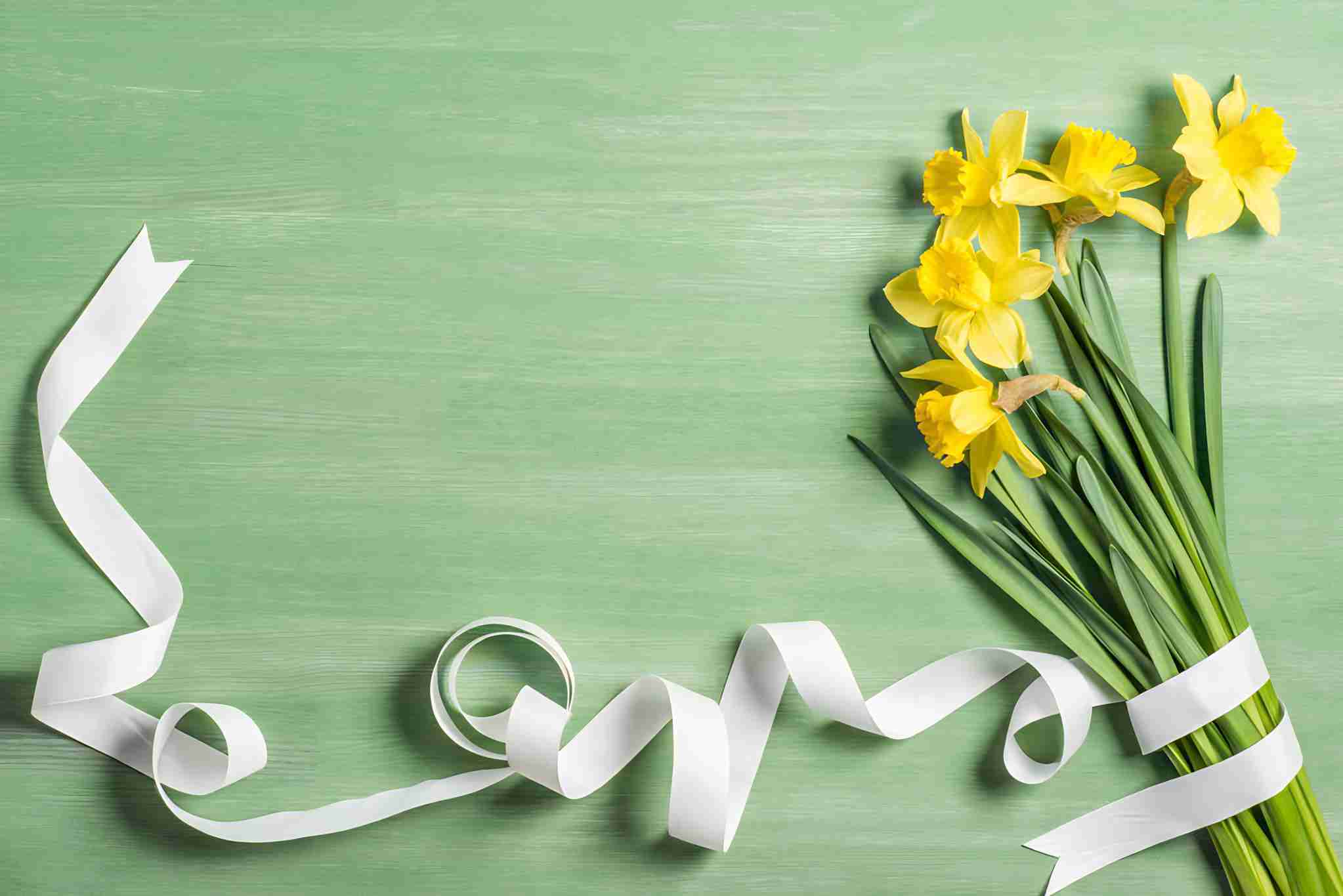 view from above of bouquet of daffodils wrapped by white ribbon on green background