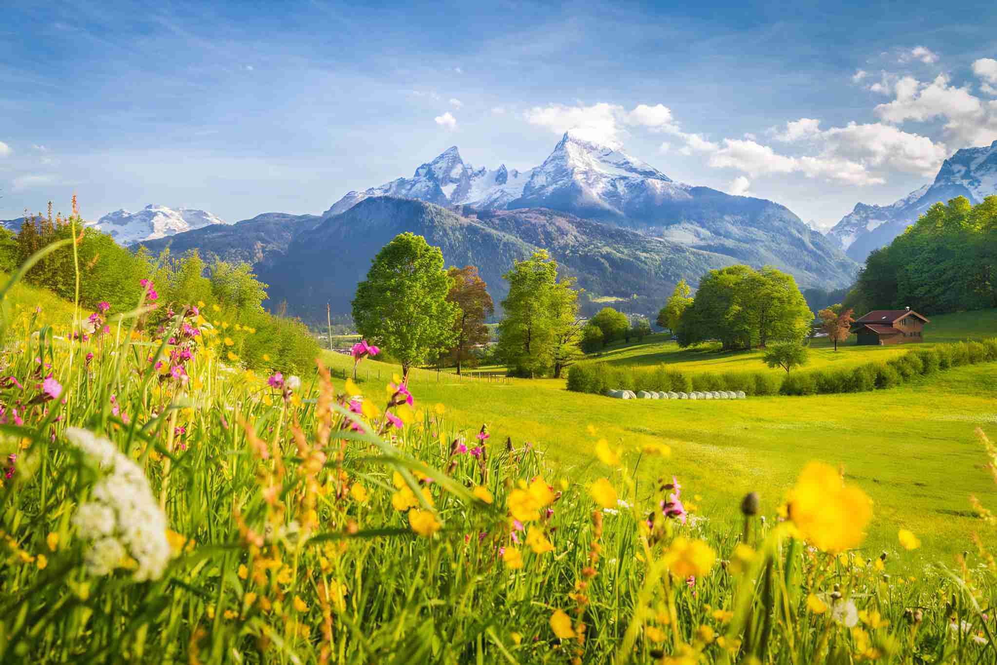 Beautiful view of idyllic alpine mountain scenery with blooming meadows and snowcapped mountain peak