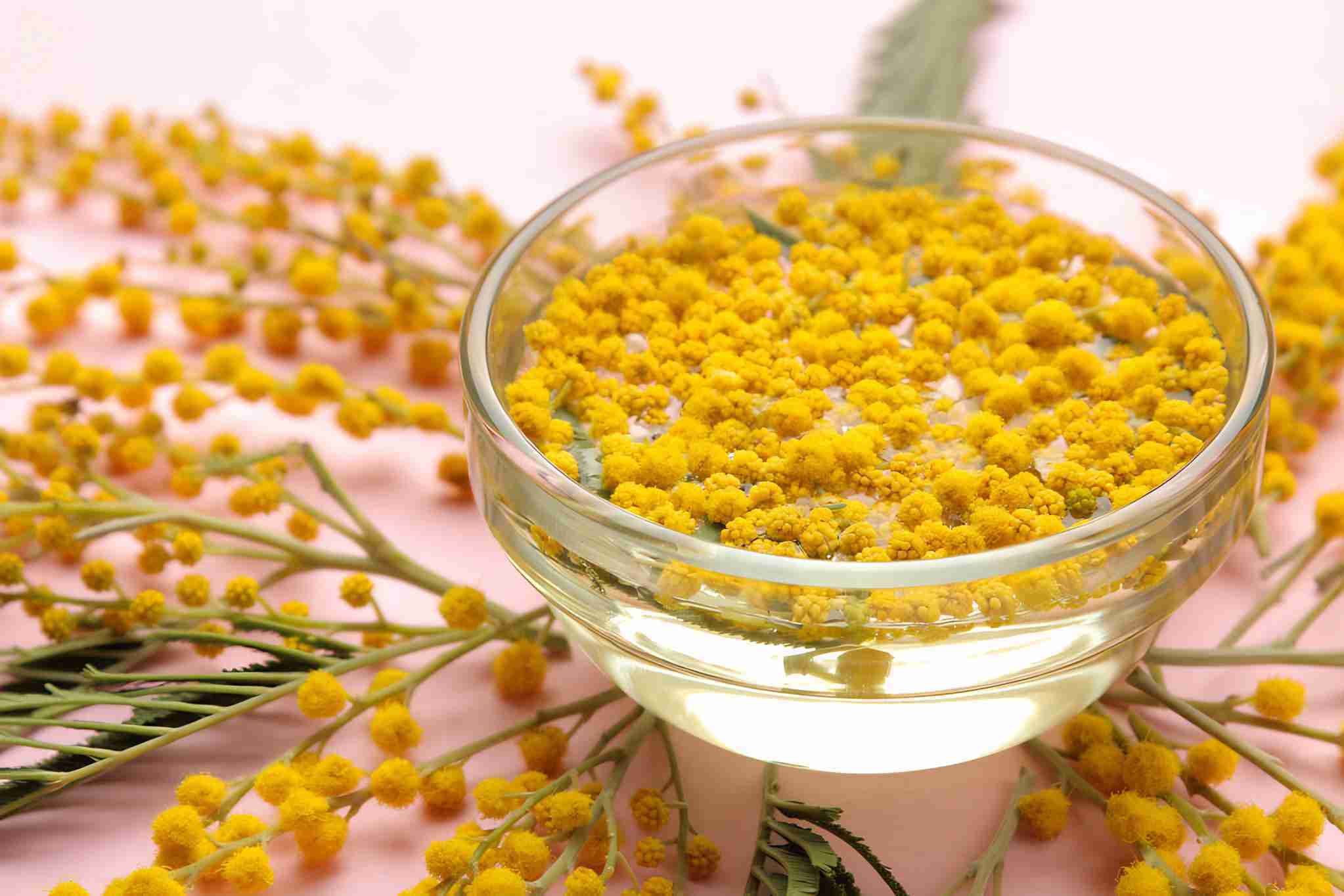 Beautiful flowers of yellow mimosa in a bowl of water on a pink trend background. close-up