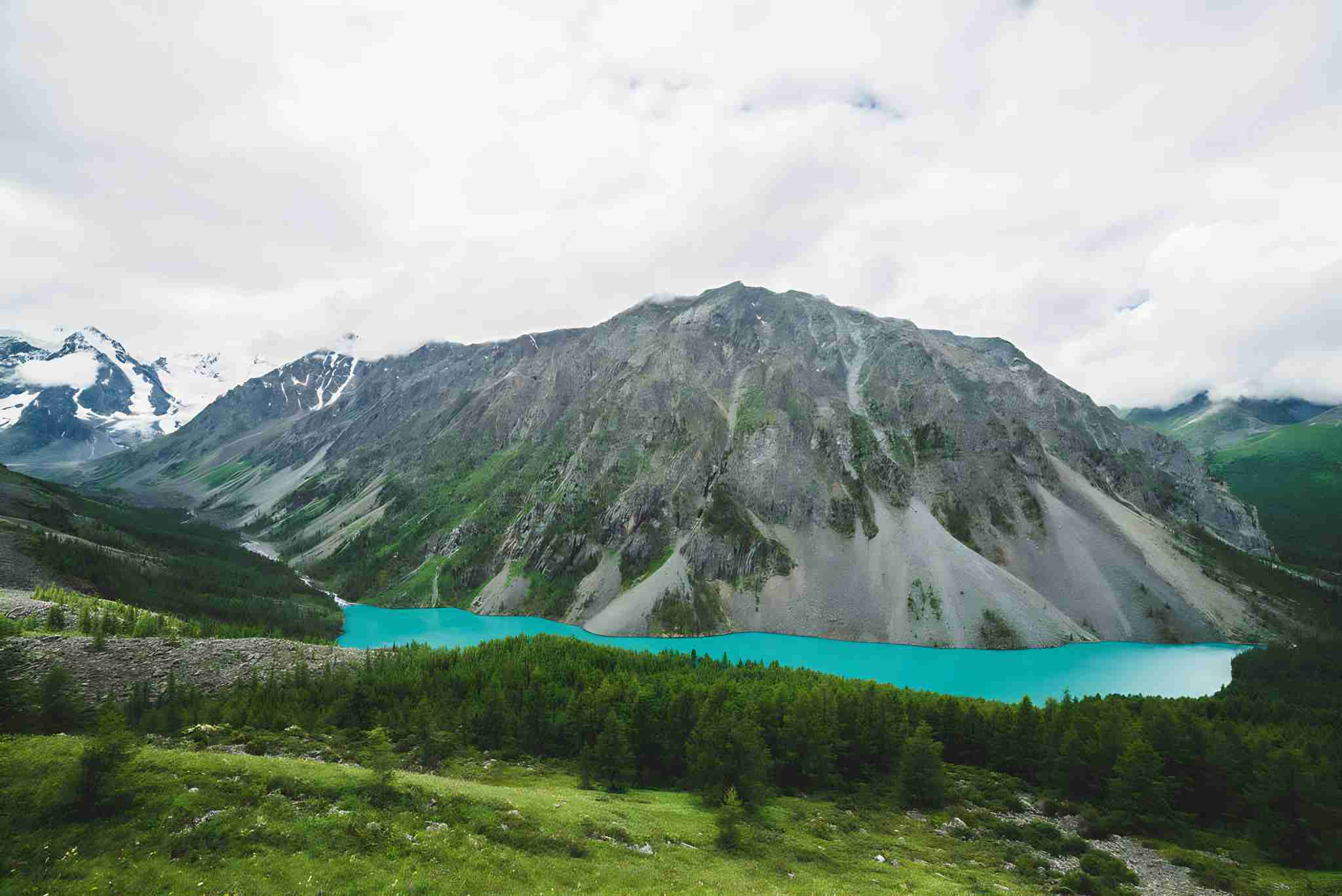 Spectacular view from hill to scenic valley with big beautiful mountain lake. Forest and rocks. Gian