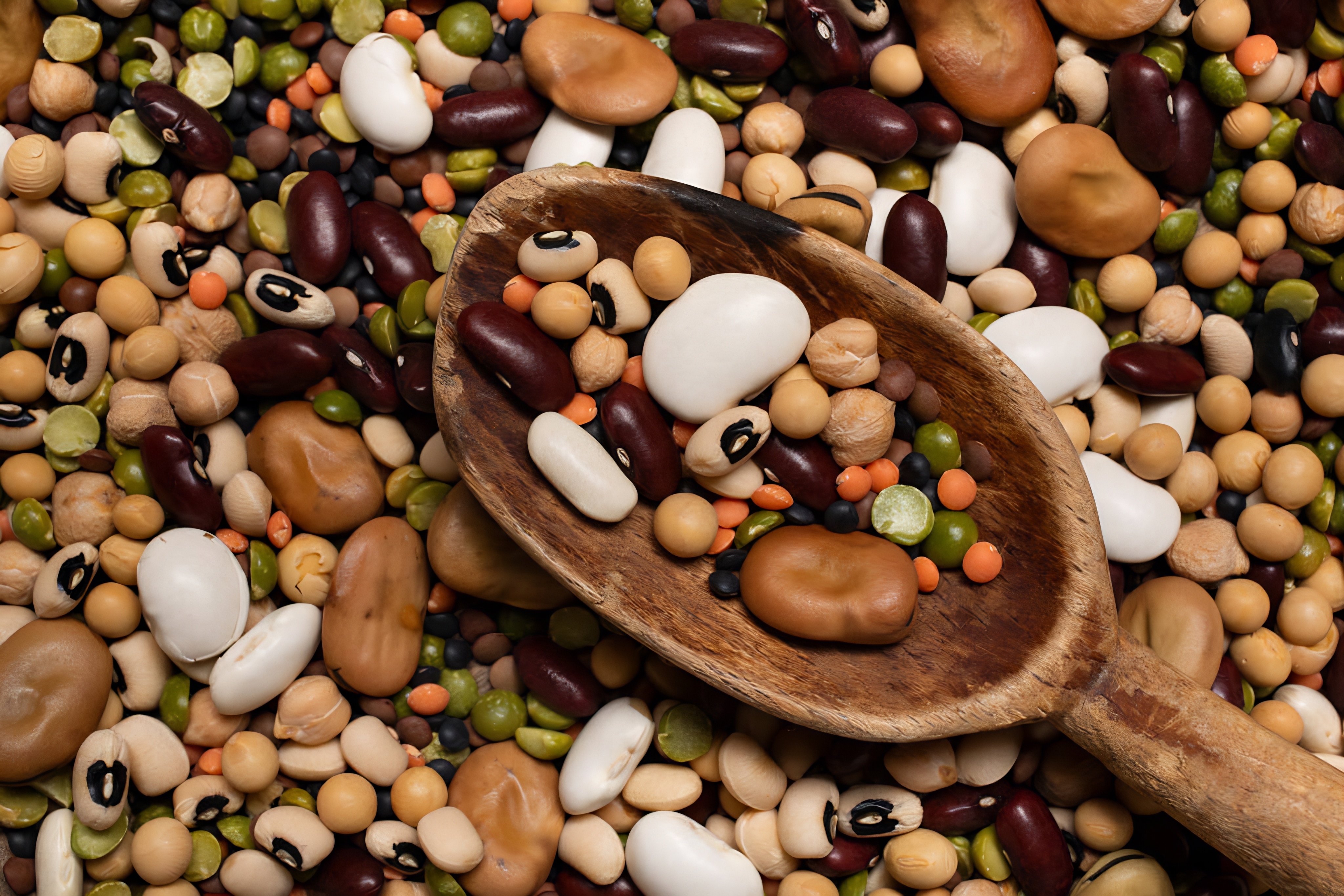 背景有各种富含蛋白质的生多彩干豆类,适合健康饮食