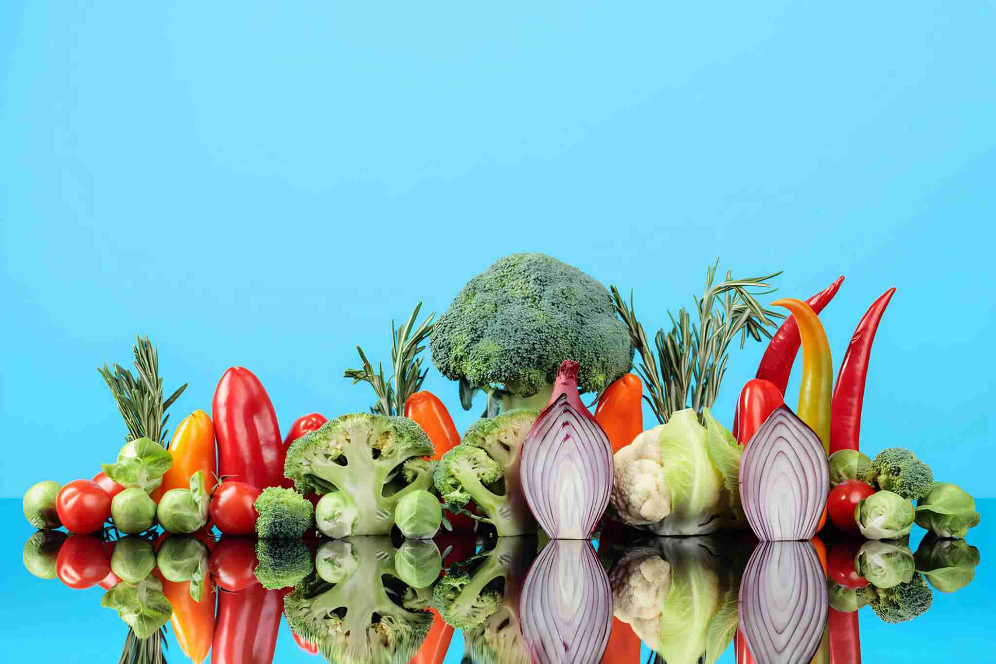 蓝色背景上各种生蔬菜的组成。关于素食主义主题的概念图
