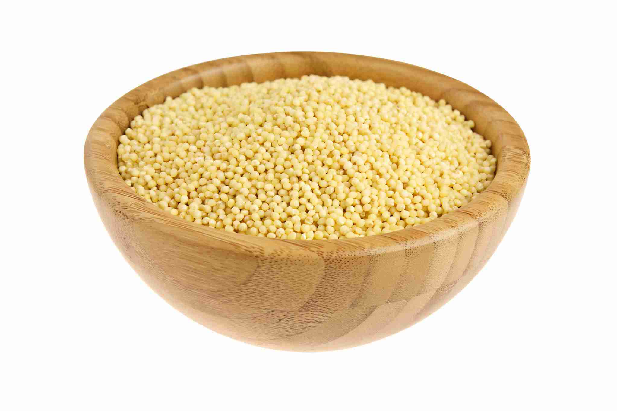 小米在孤立的白色背景上的竹碗