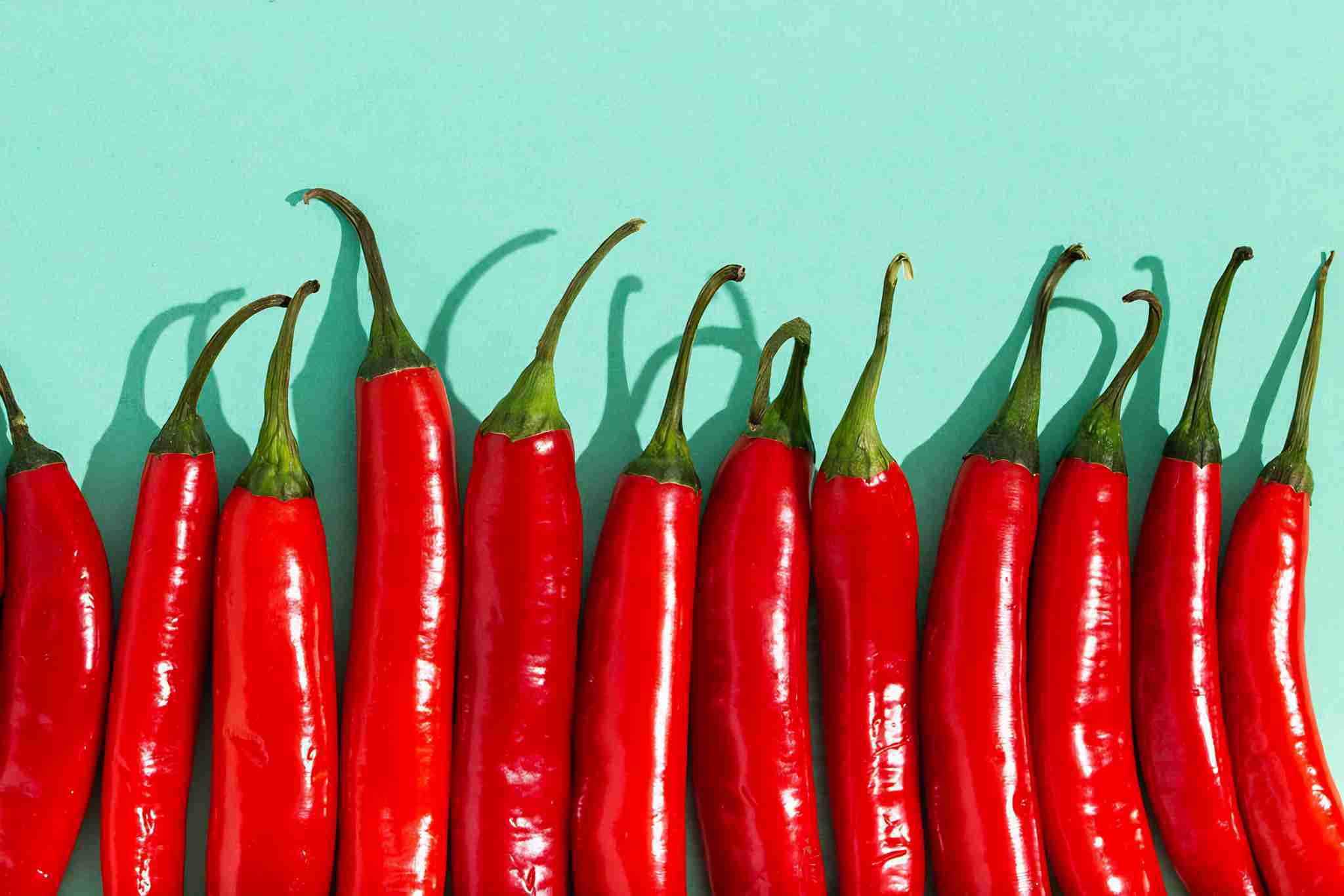 Red hot chilli peppers on minimal blue contrast background