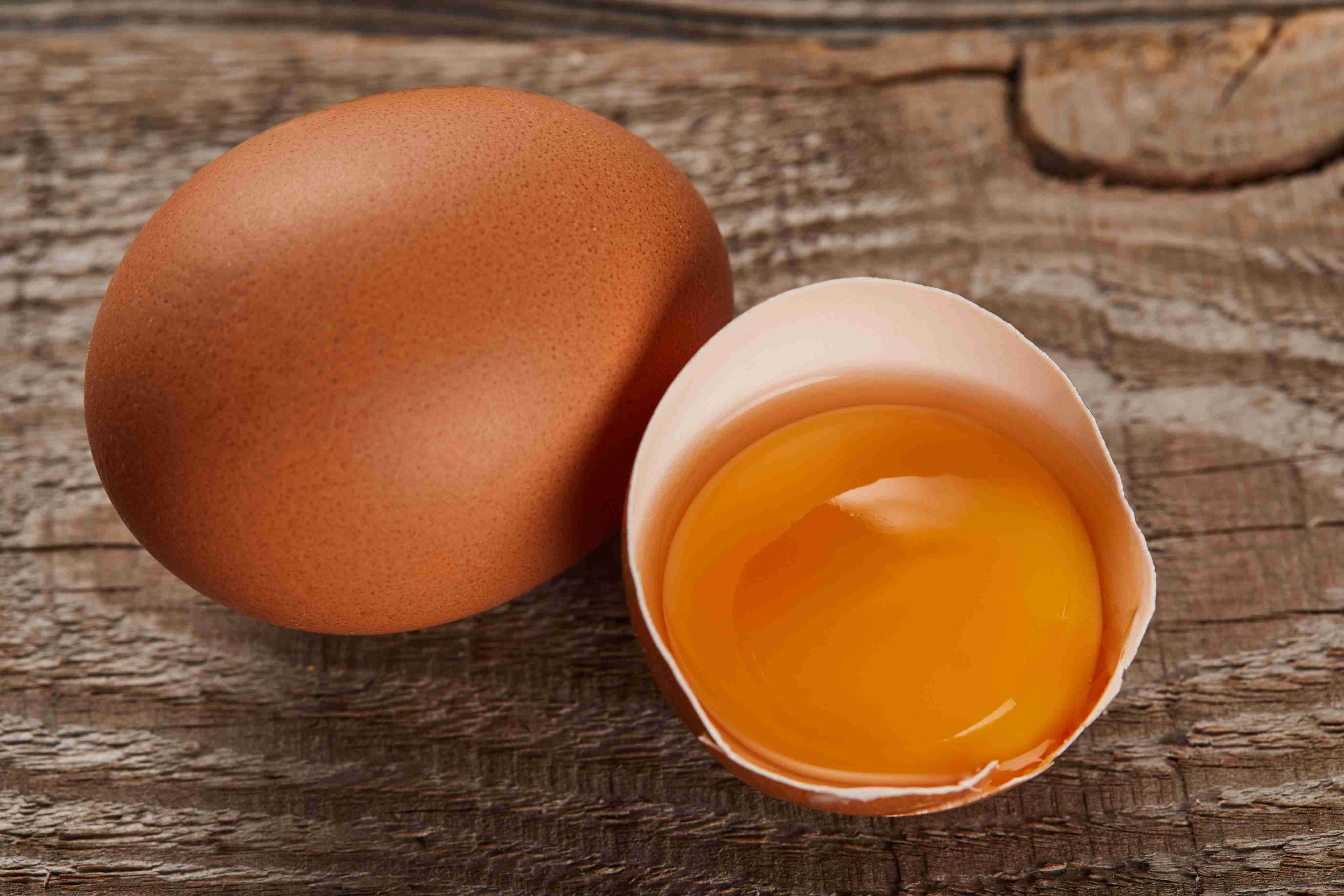 broken eggshell with yellow yolk near egg on wooden table