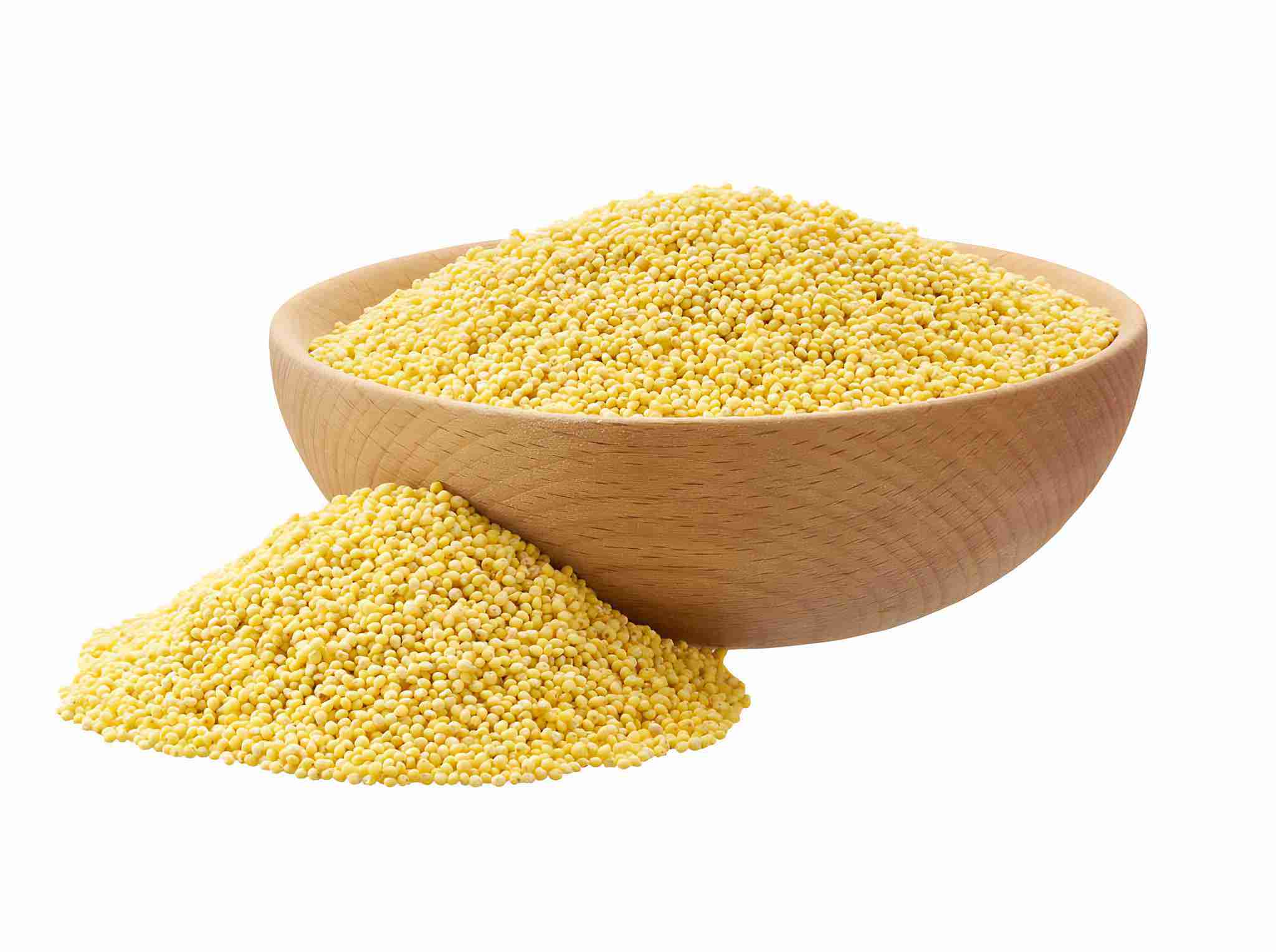 Raw millet yellow grains in a wooden bowl isolated on white background.