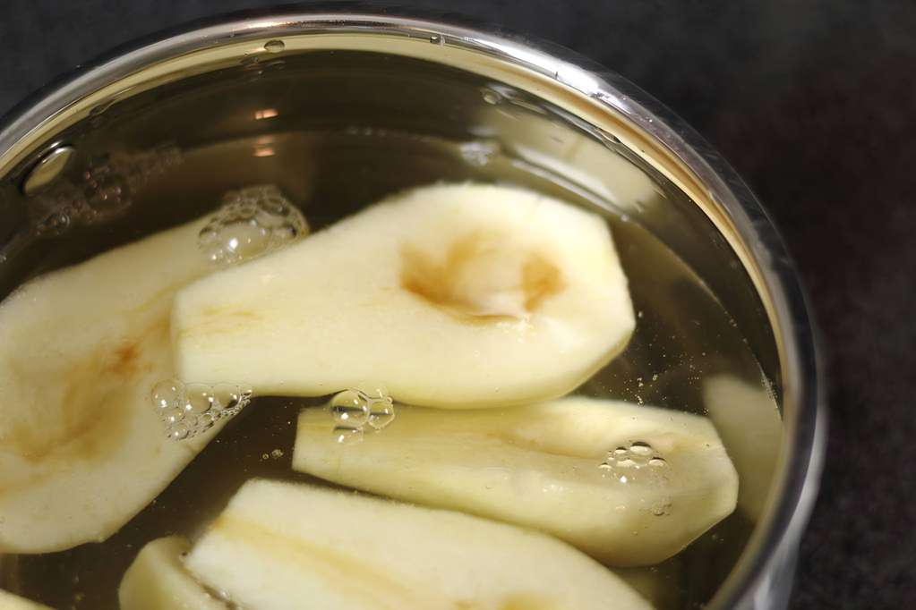 Pear halves with removed cores in pan with water