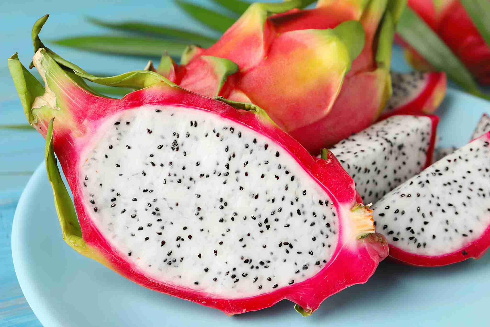 Plate with delicious cut and whole white pitahaya fruits on table, closeup