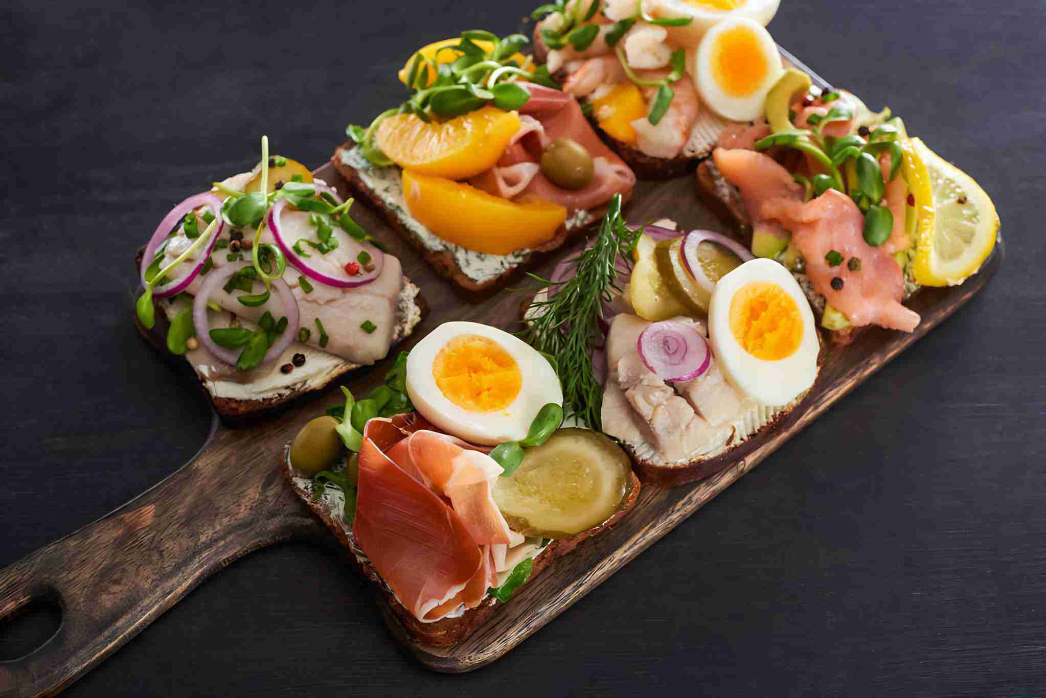 黑麦面包的选择性焦点与灰色表面上的丹麦 smorrebrod 三明治