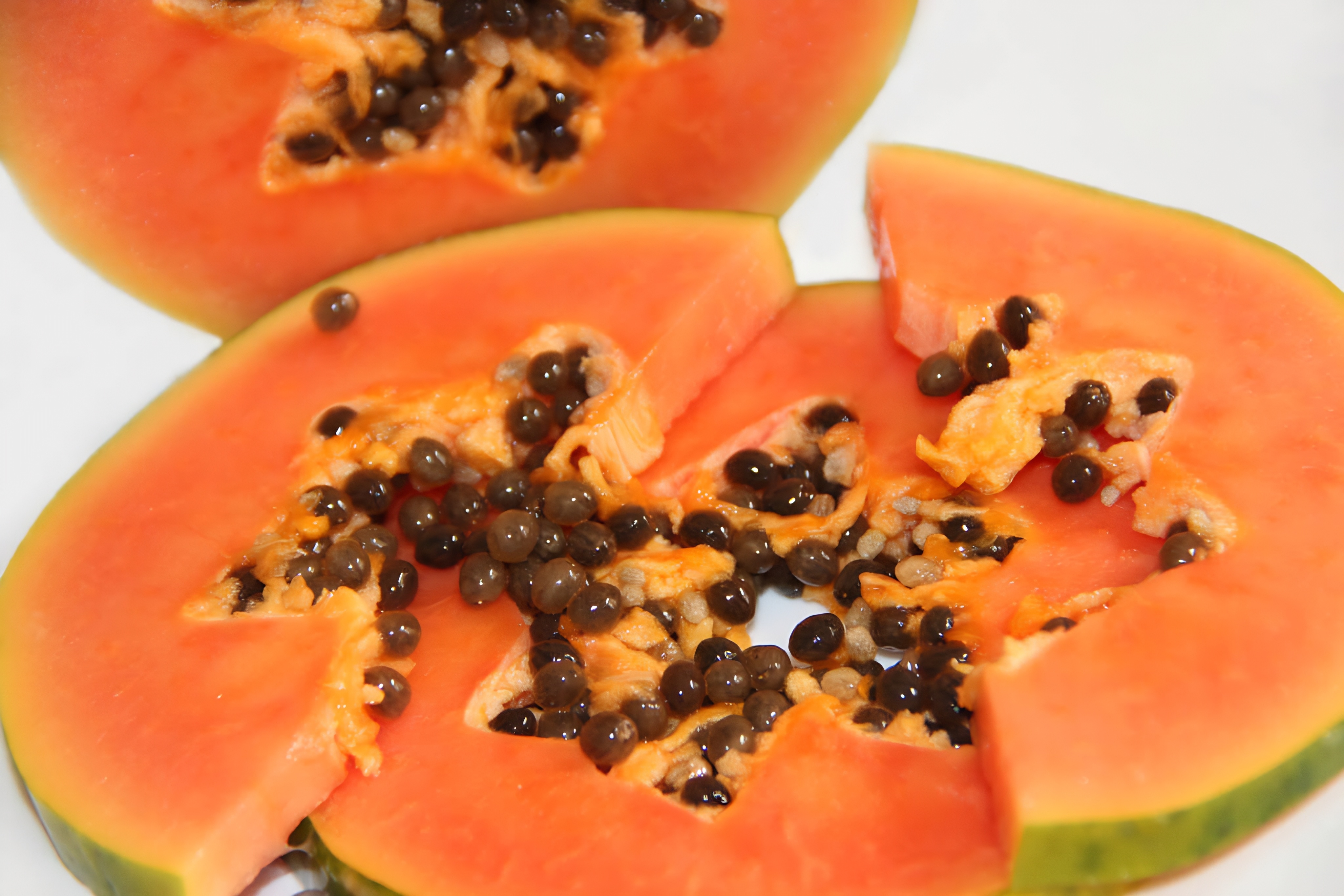papaya fruit with seeds. Cut papaya slice on white background. Ripe sweet papaya fruits