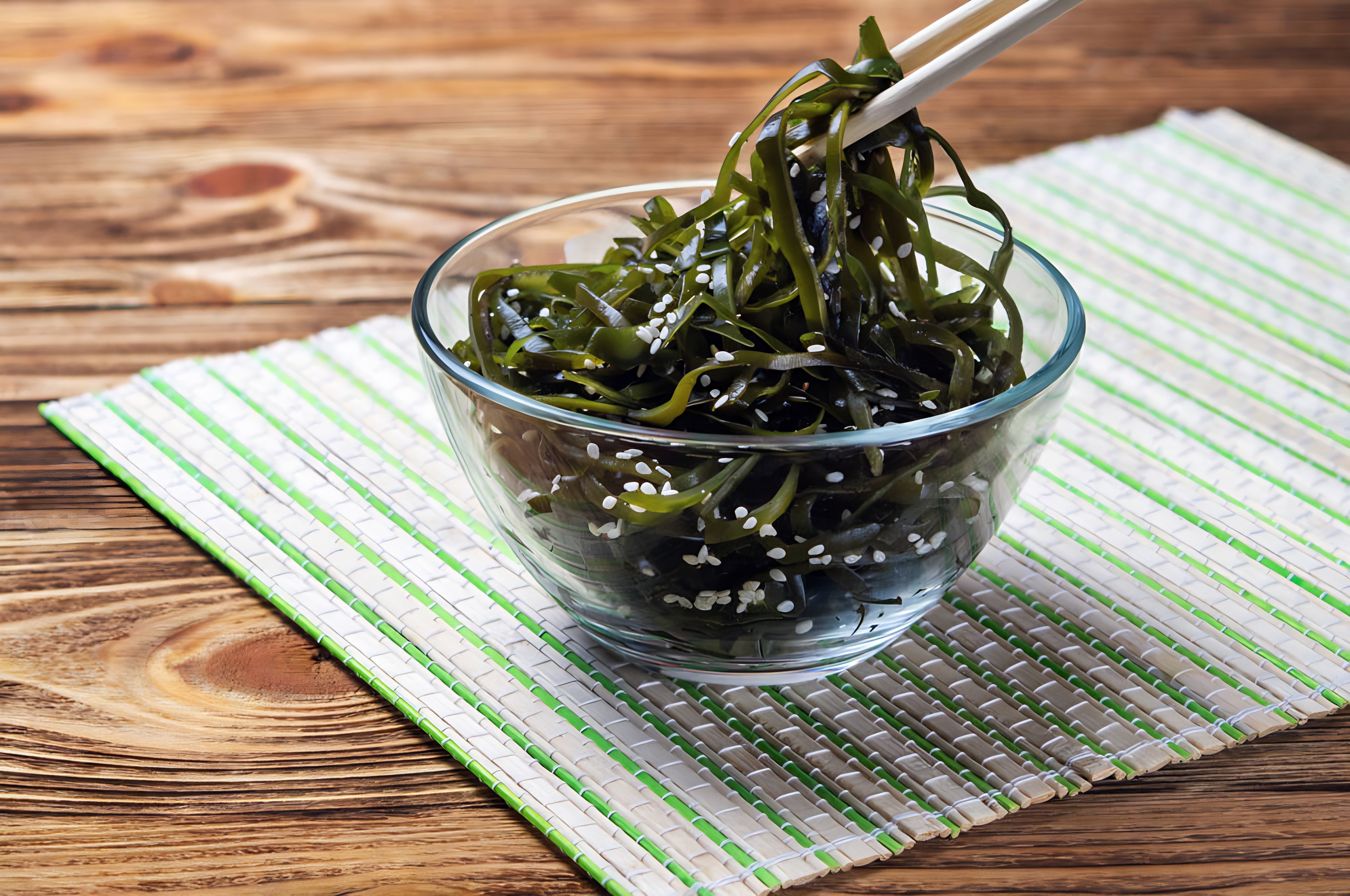 Seaweed salad. Asian cuisine. Seaweed (kelp) in a glass bowl sprinkled with sesame seeds, with woode