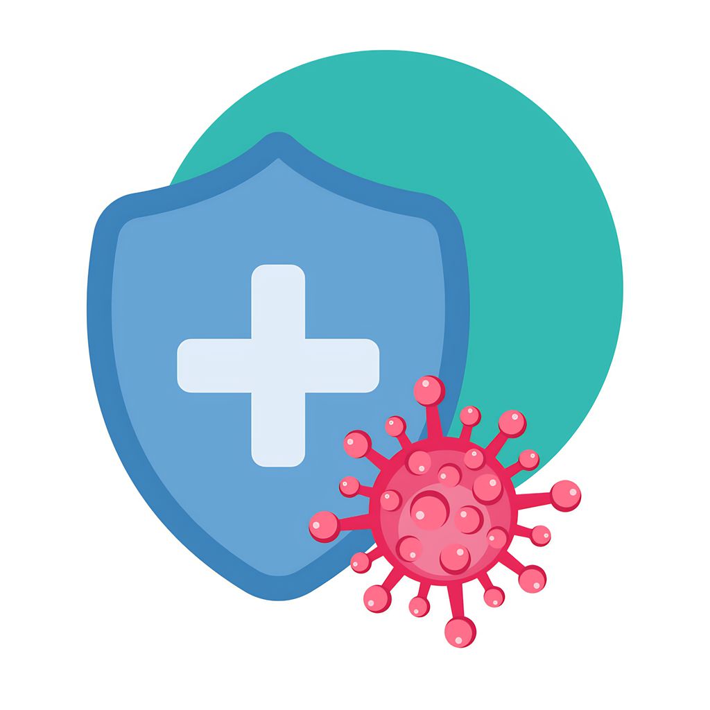 Immune system concept. Medical shield surrounded by viruses and bacterium. Protect from virus. Vector illustration isolated on white background.