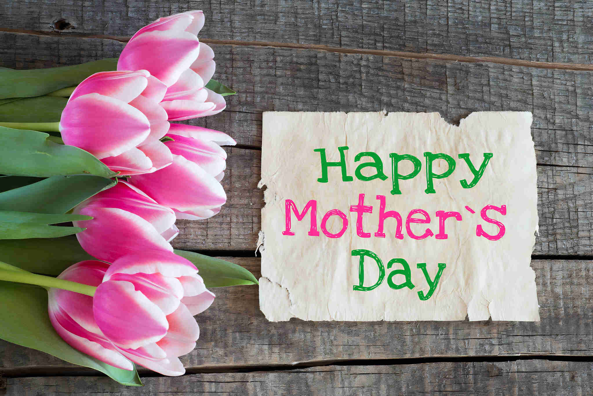 Flowers and card with words HAPPY MOTHER'S DAY on wooden background