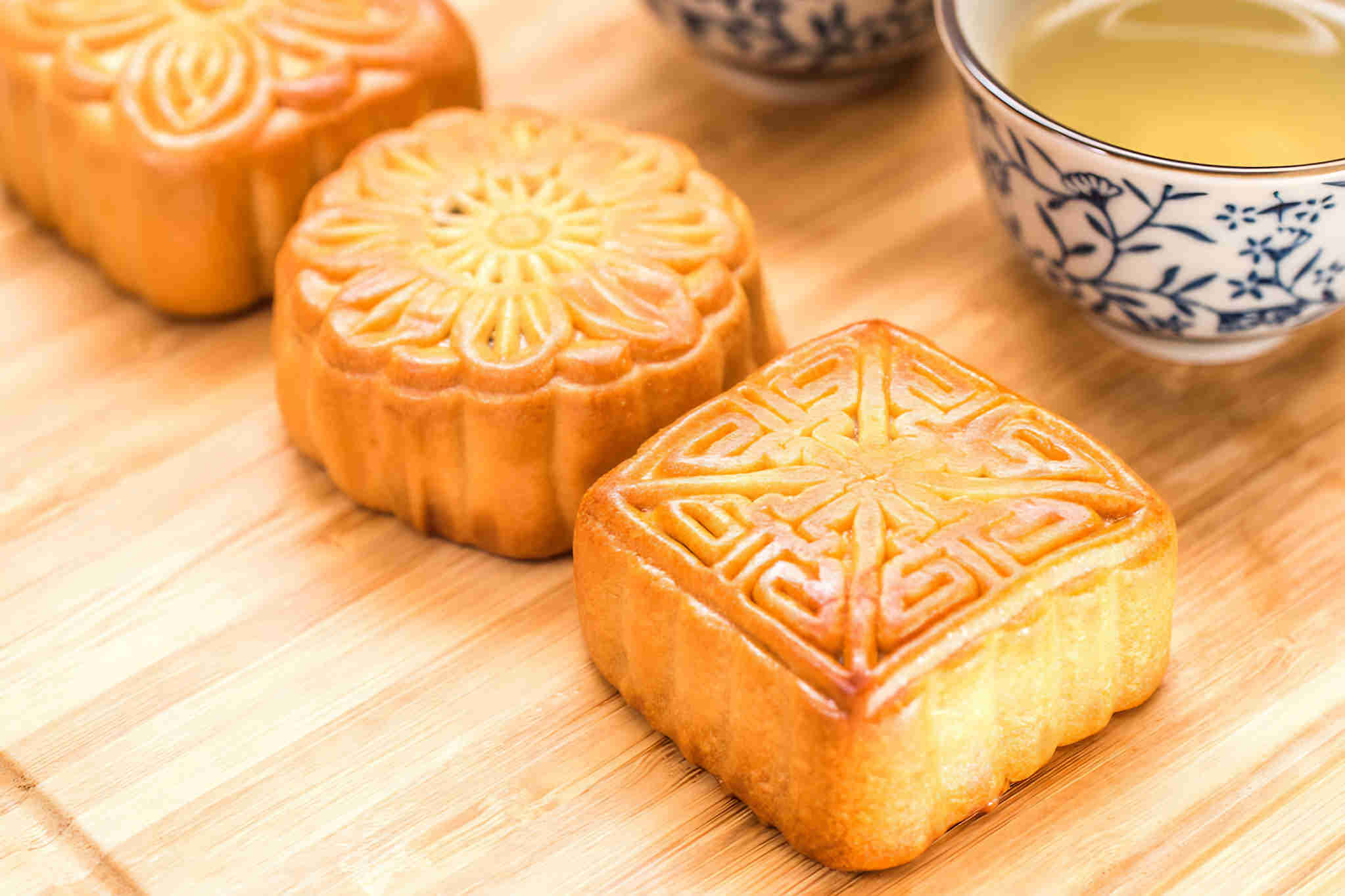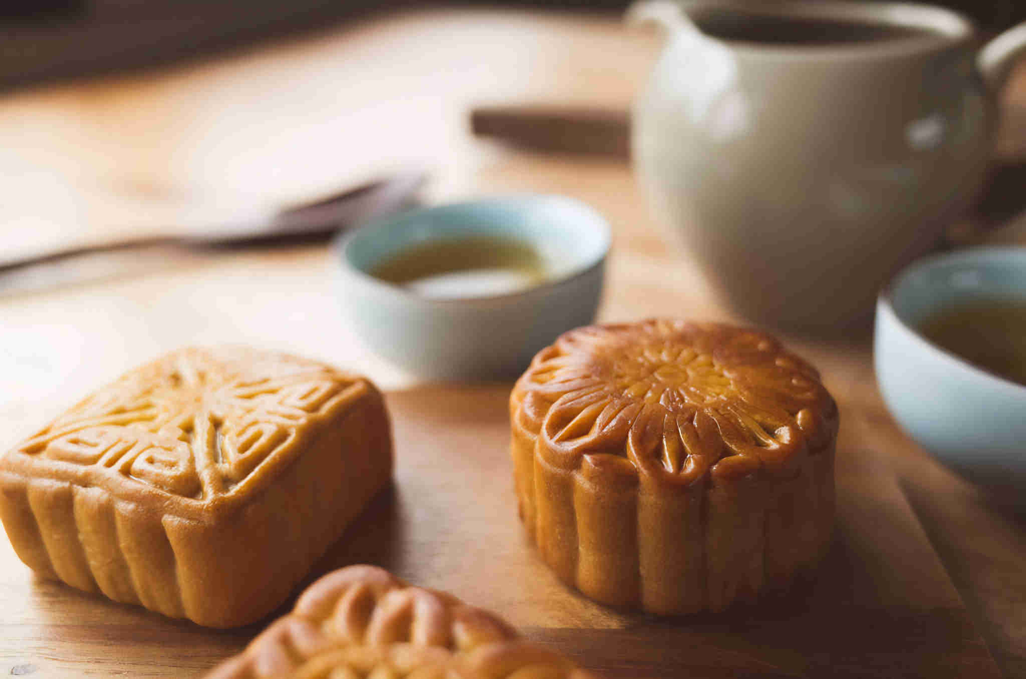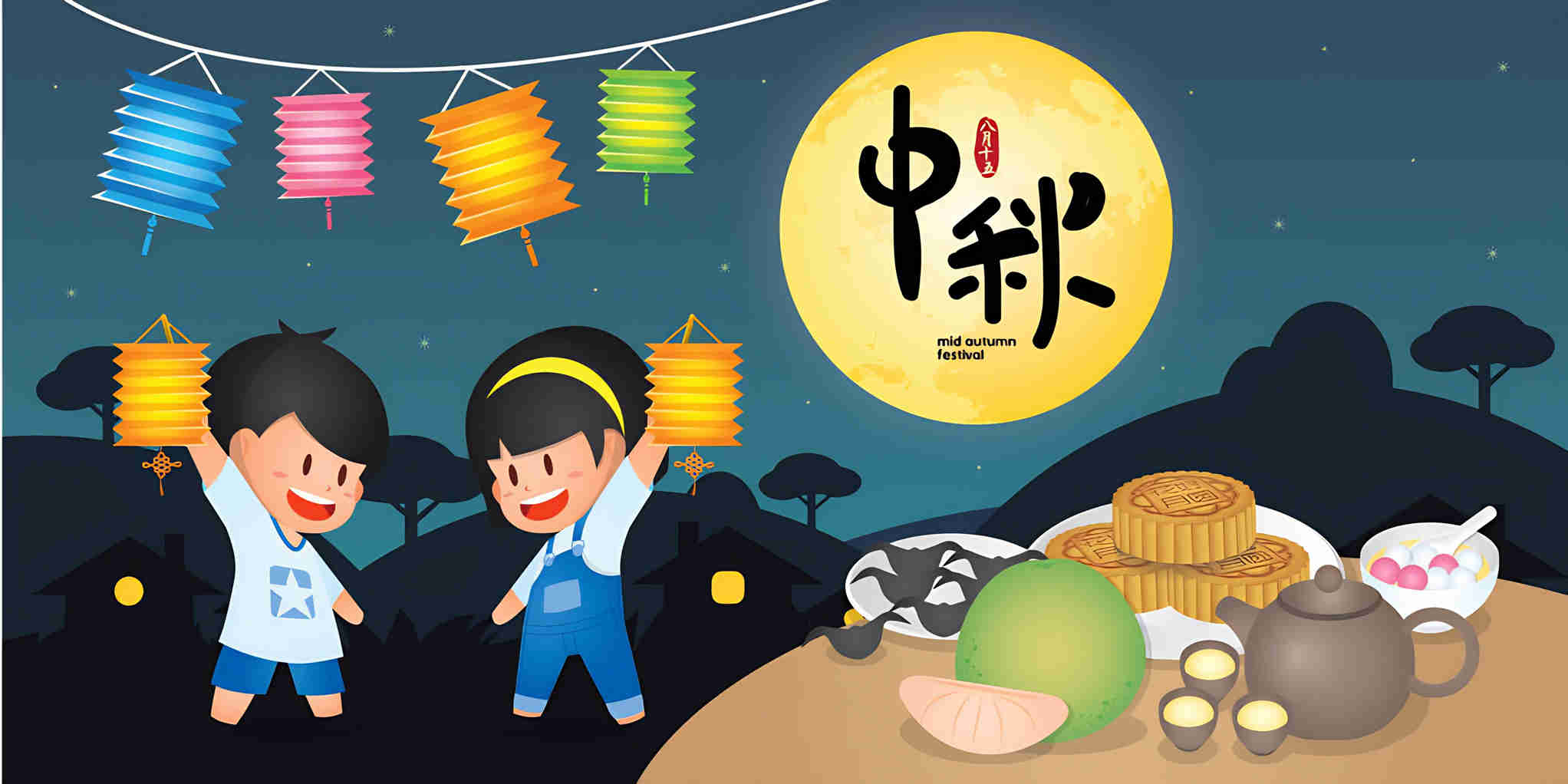 Mid autumn festival or Zhong Qiu Jie banner illustration with traditional festival food and cute chi