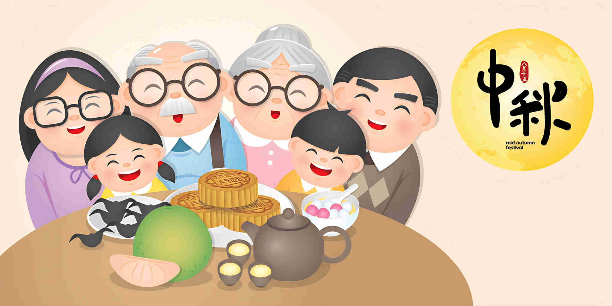 Mid autumn festival or Zhong Qiu Jie banner illustration with happy family with traditional food. Ca