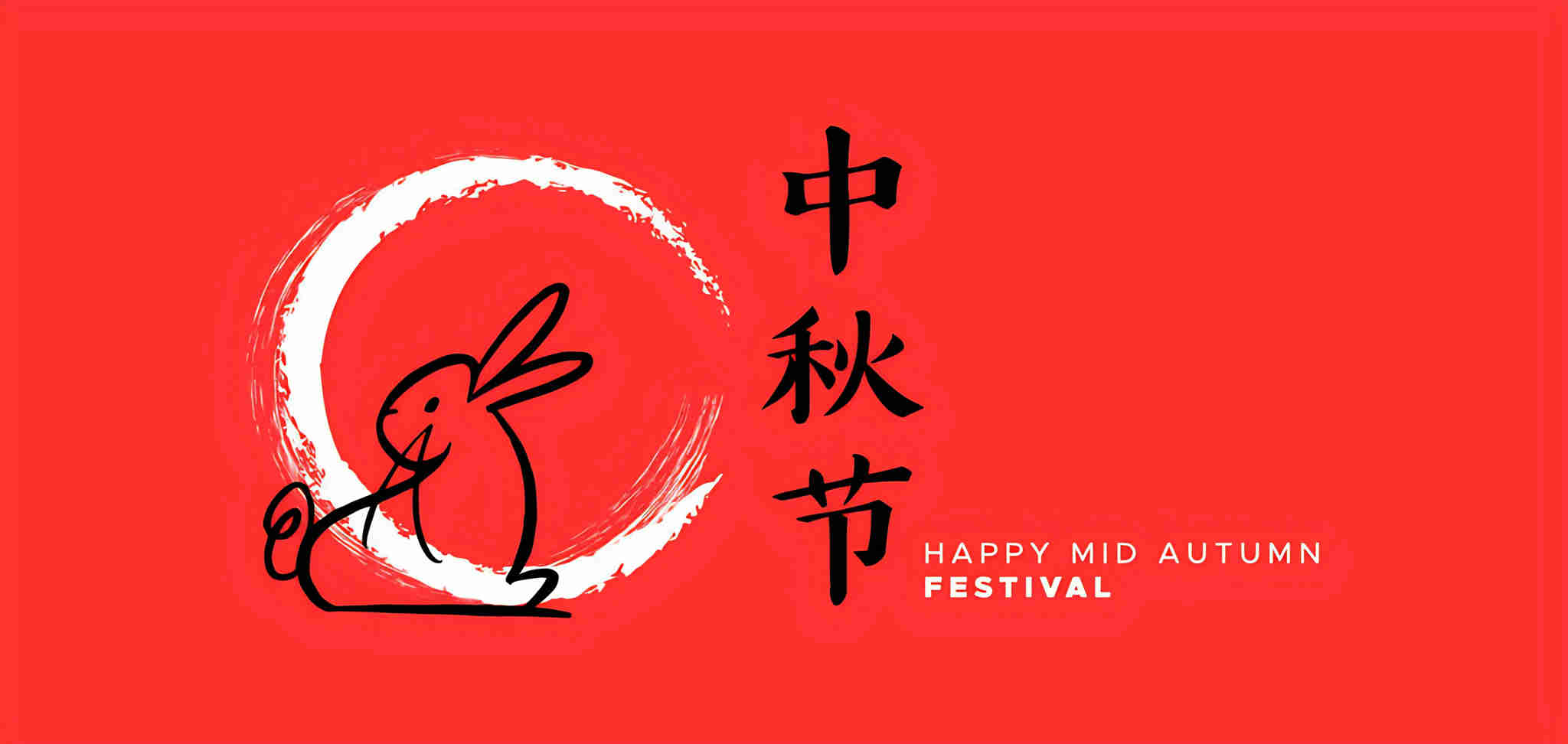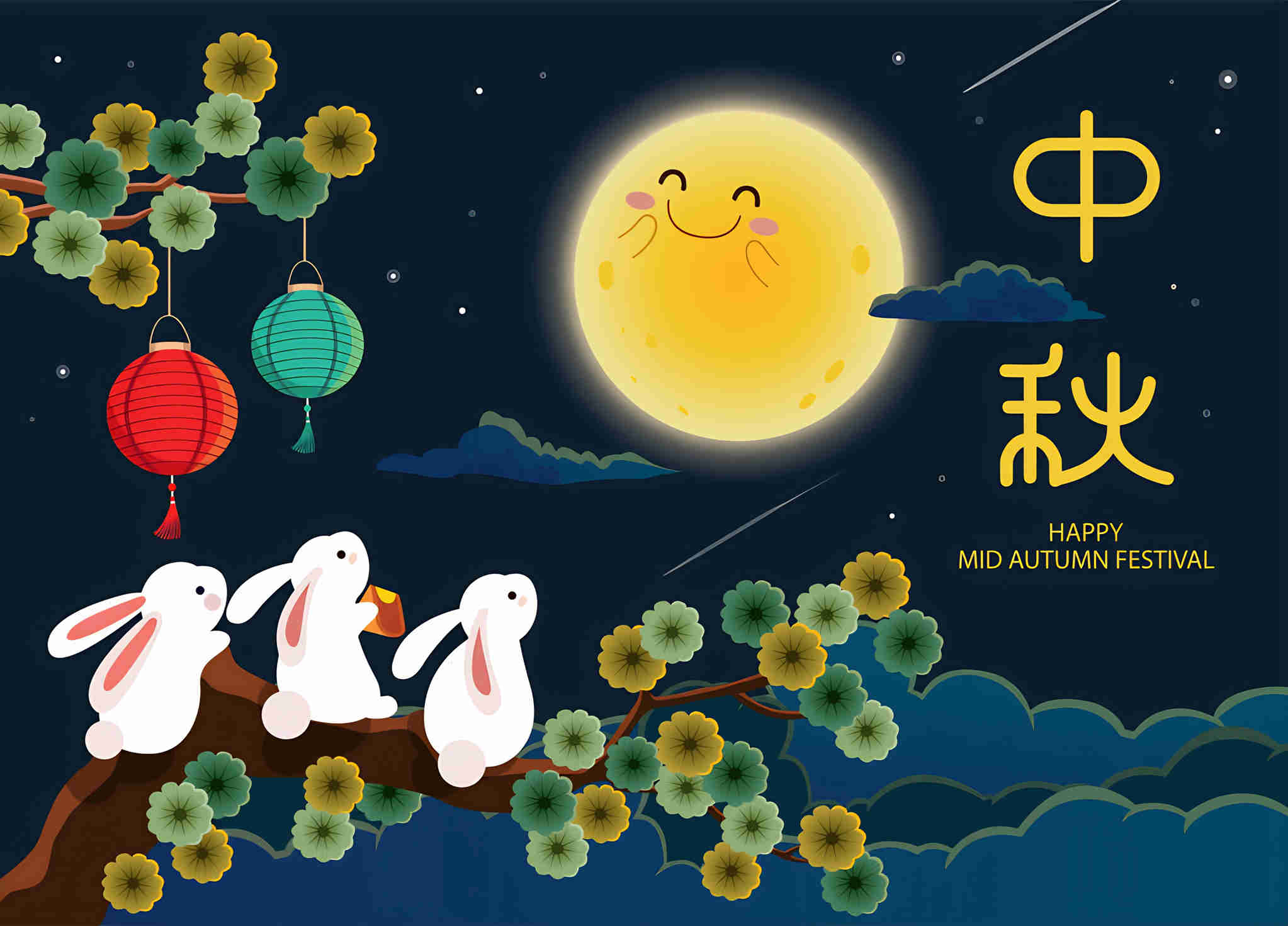 Mid Autumn Festival with cute rabbits enjoying mooncake and the cute full moon. Chinese translate: M