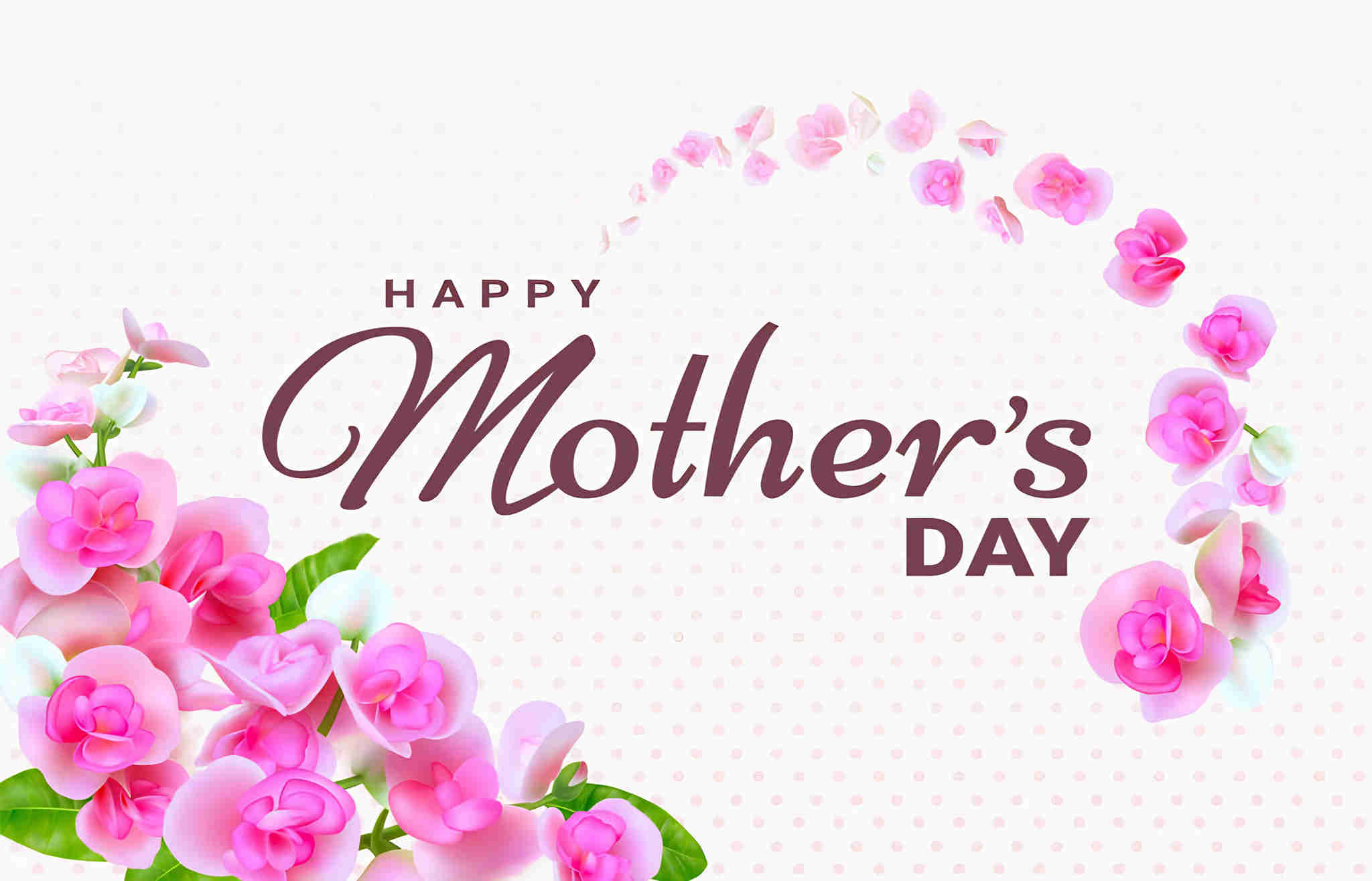 Happy Mother's Day. Greeting card with beautiful blooming flowers on light pink dots backgr