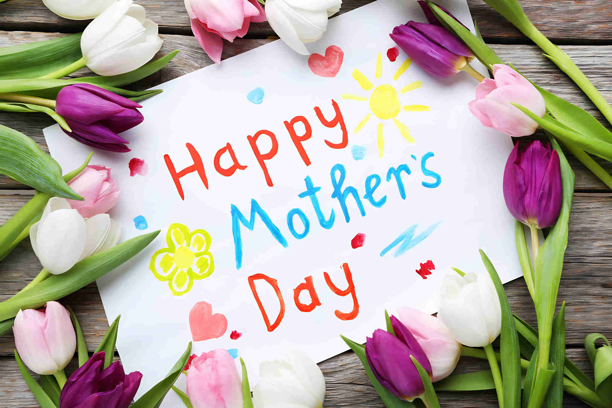 Happy Mother's Day. Greeting card with beautiful blooming flowers on light pink dots backgr