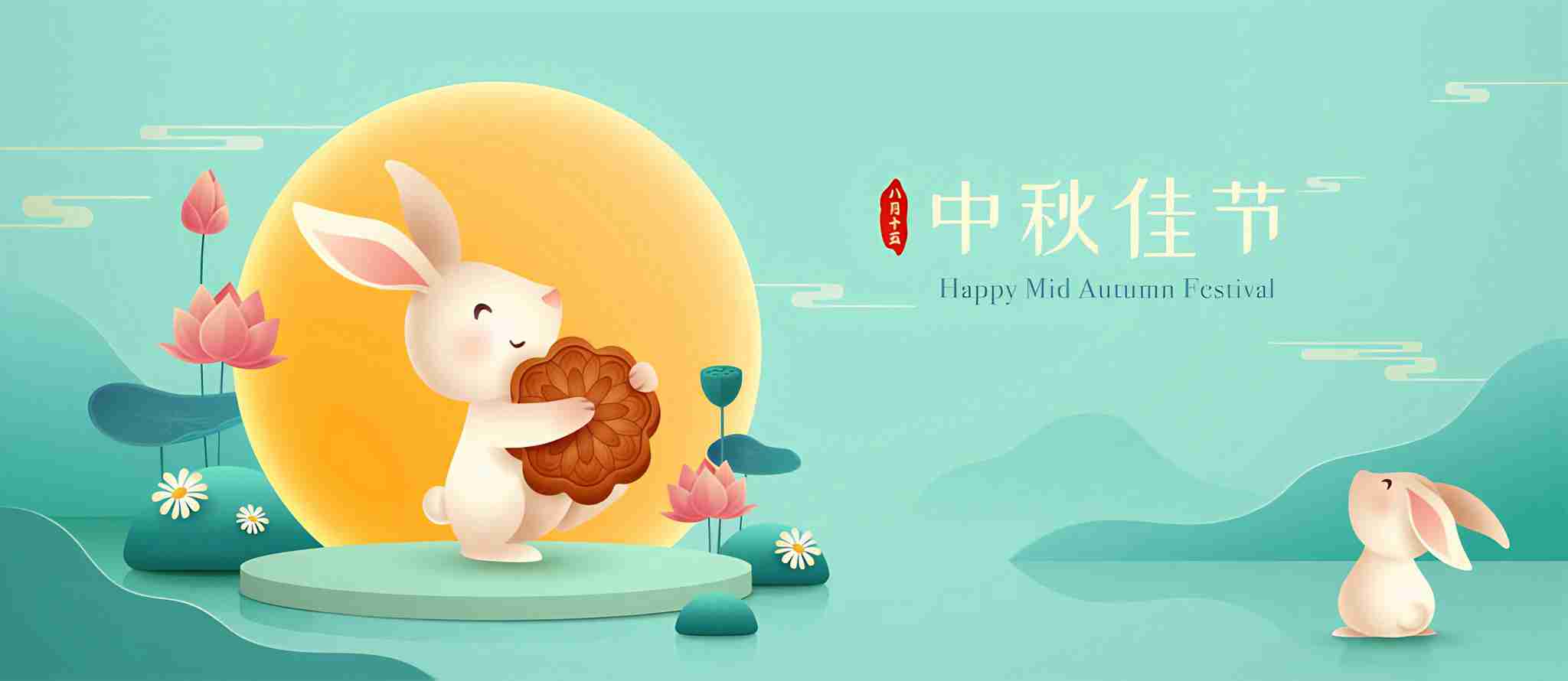 3D illustration of Mid Autumn Mooncake Festival theme with cute rabbit character on mooncake podium