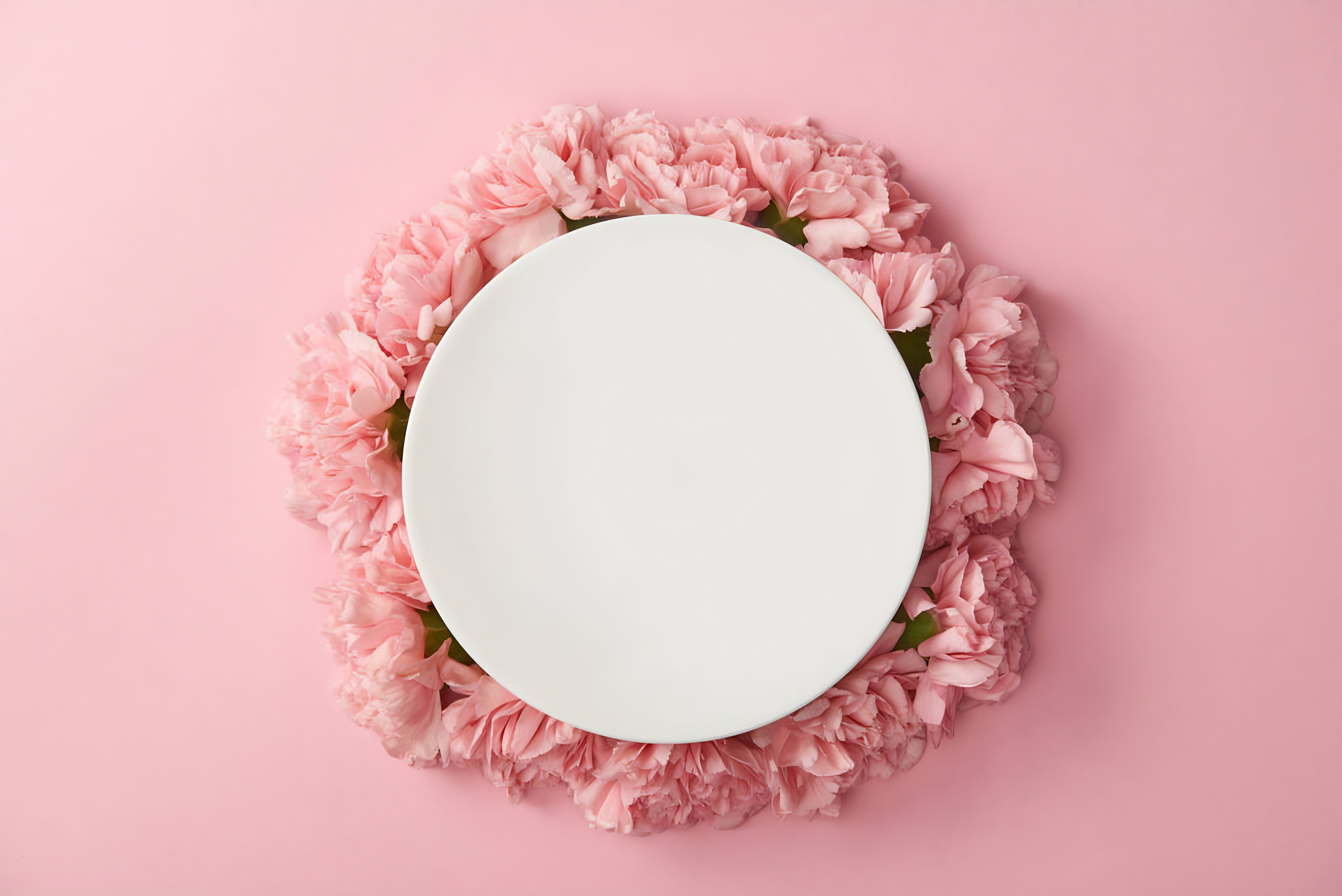 top view of round white plate and beautiful pink flowers isolated on pink background