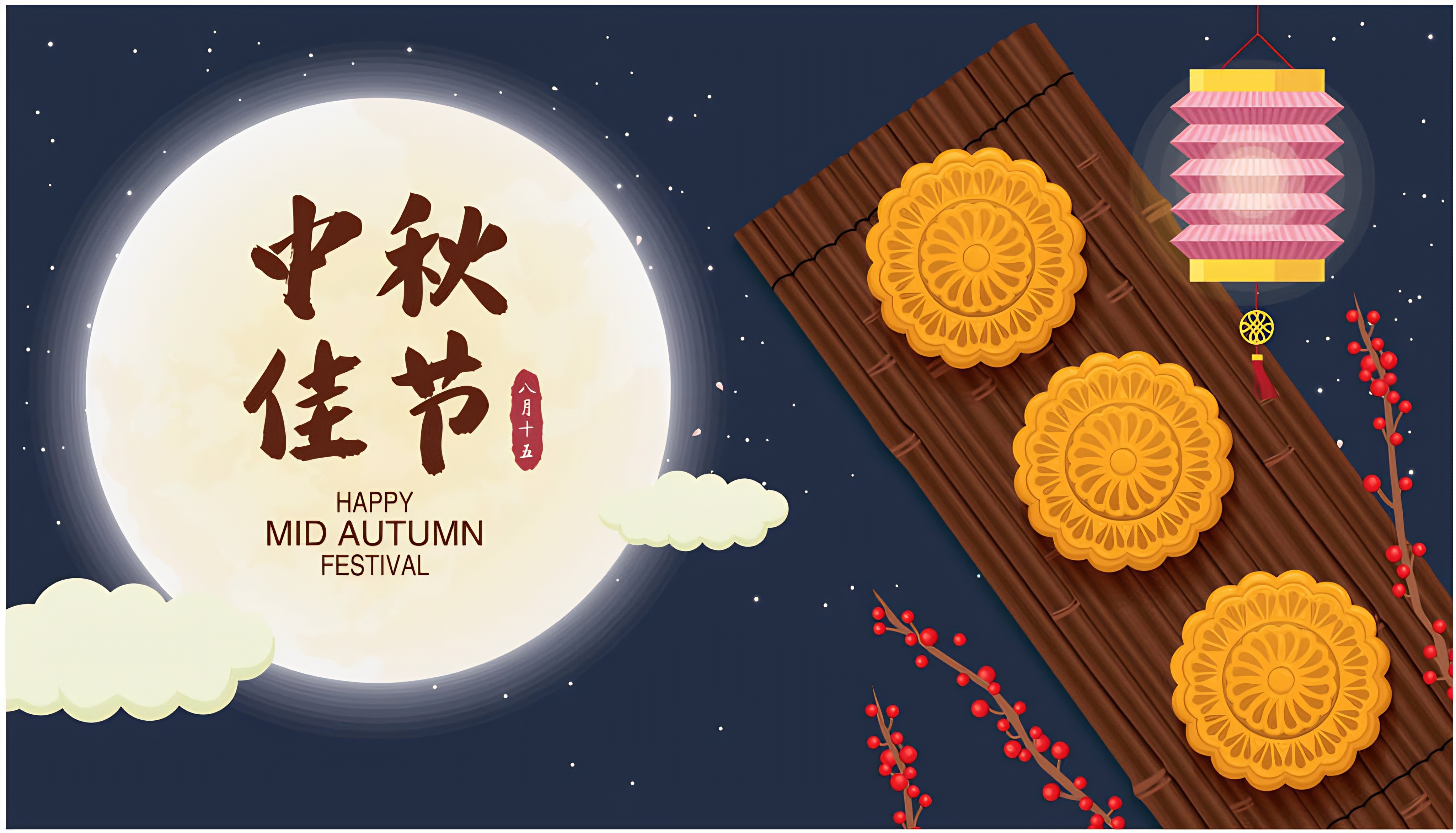 Mid Autumn Festival with cute rabbits enjoying mooncake and the cute full moon. Chinese translate: M