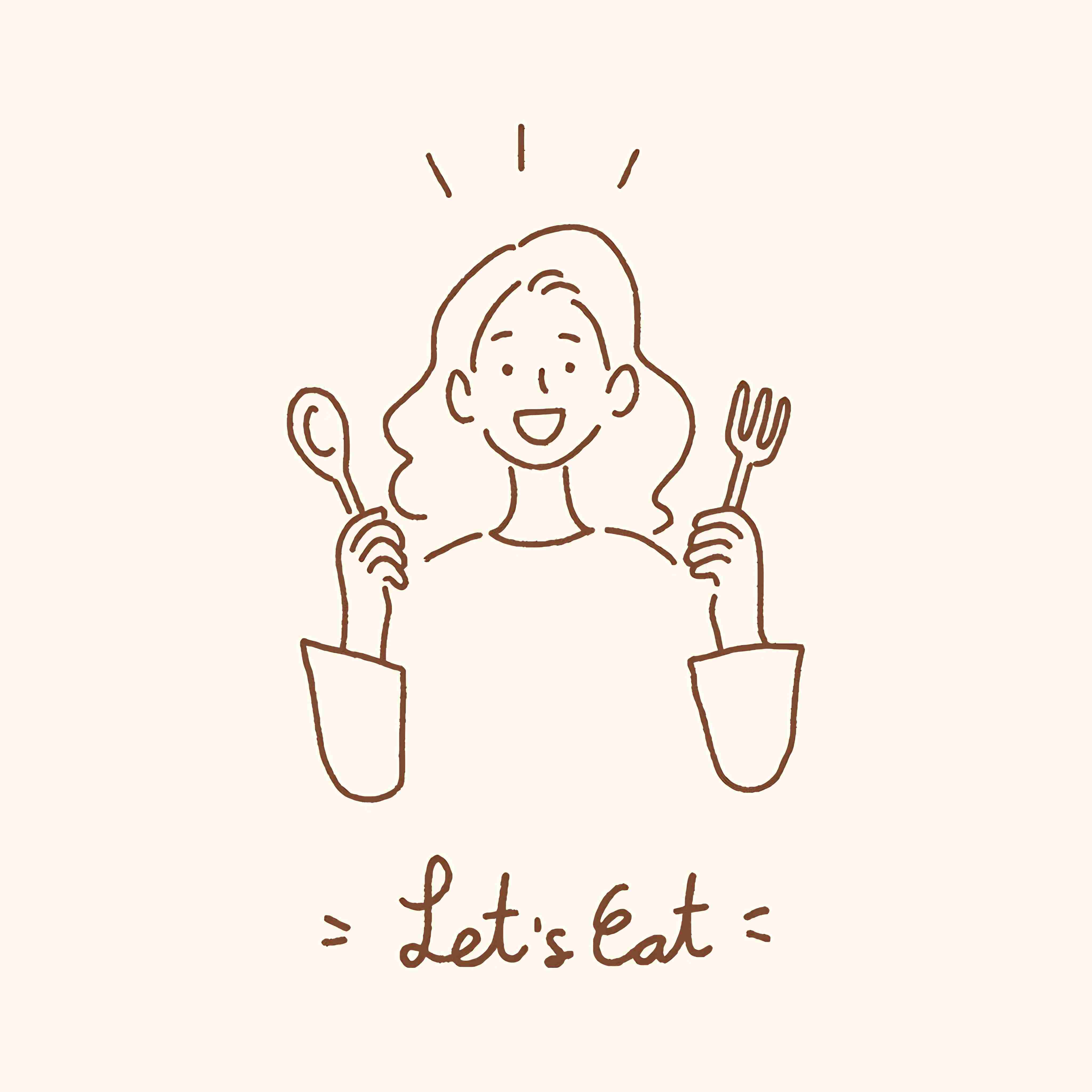 Young woman holding spoon and fork with Let's Eat handwritten lettering, eating dining concept, hand-drawn style vector illustration