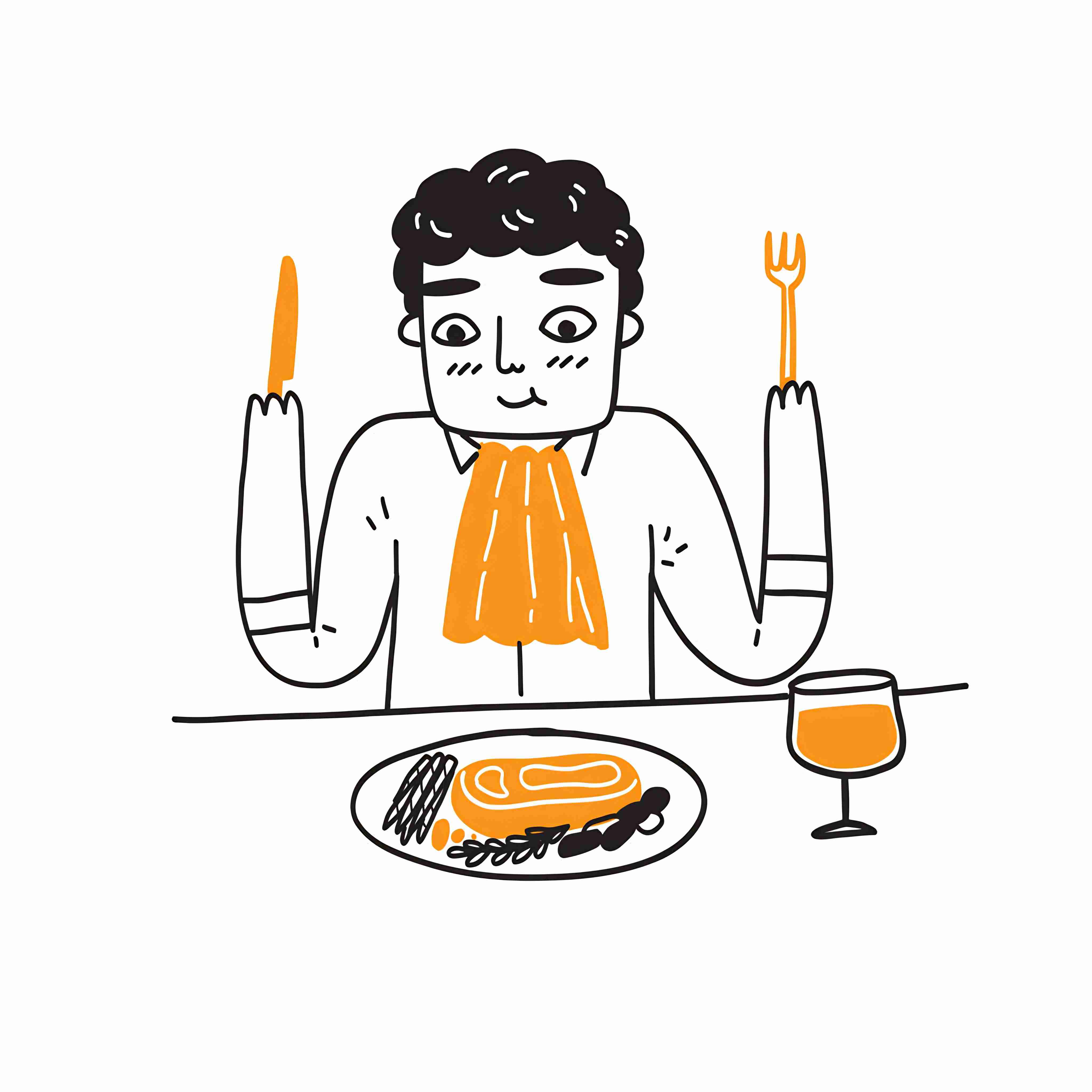 Elegant man eating a steak at a restaurant table, Hand drawing vector illustration