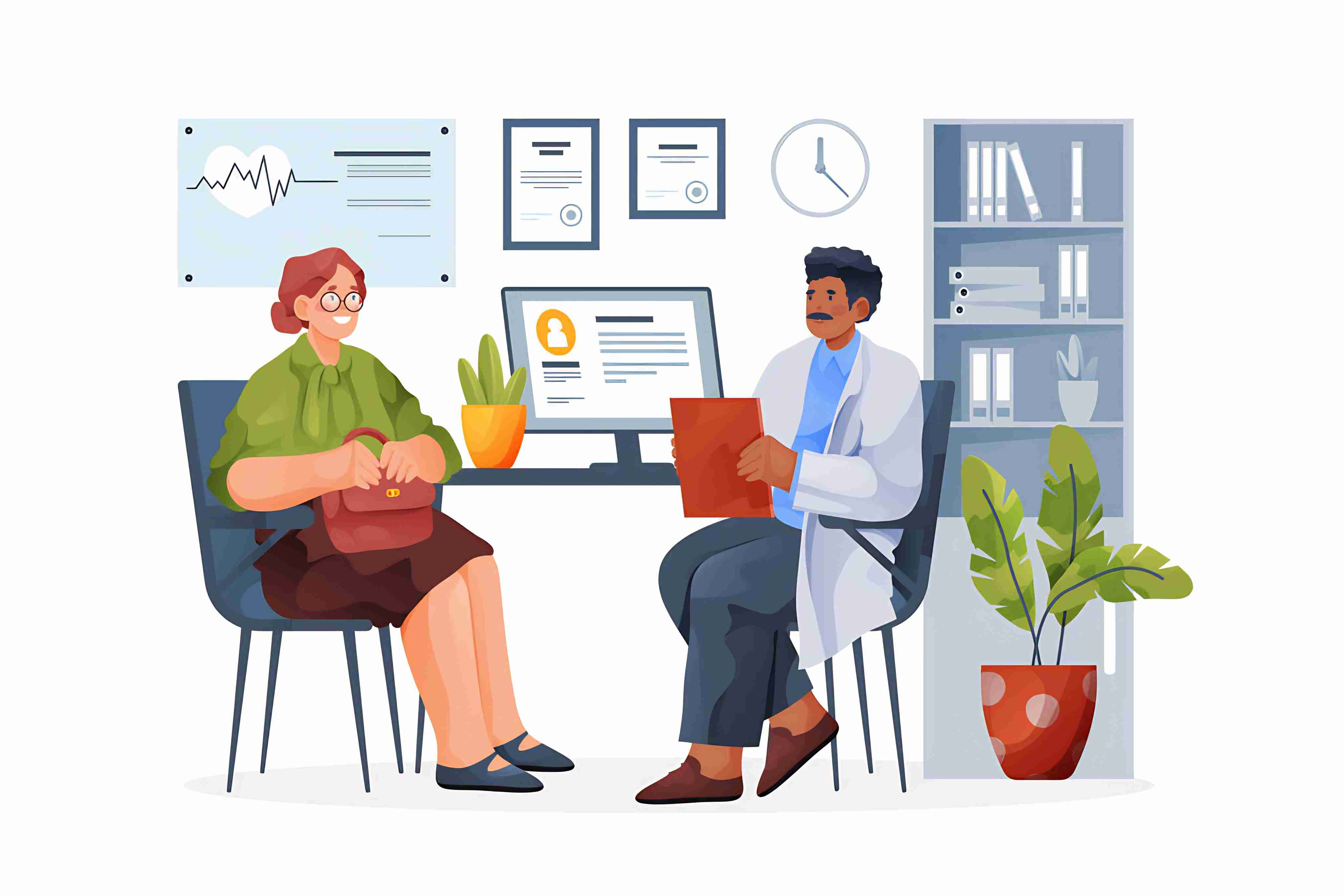 Flat vector illustration of doctor visit or consultation. Woman at medicine checkup clipart. Diagnostic at clinic or hospital appointment. Diagnosis meeting. Woman healthcare and medical theme