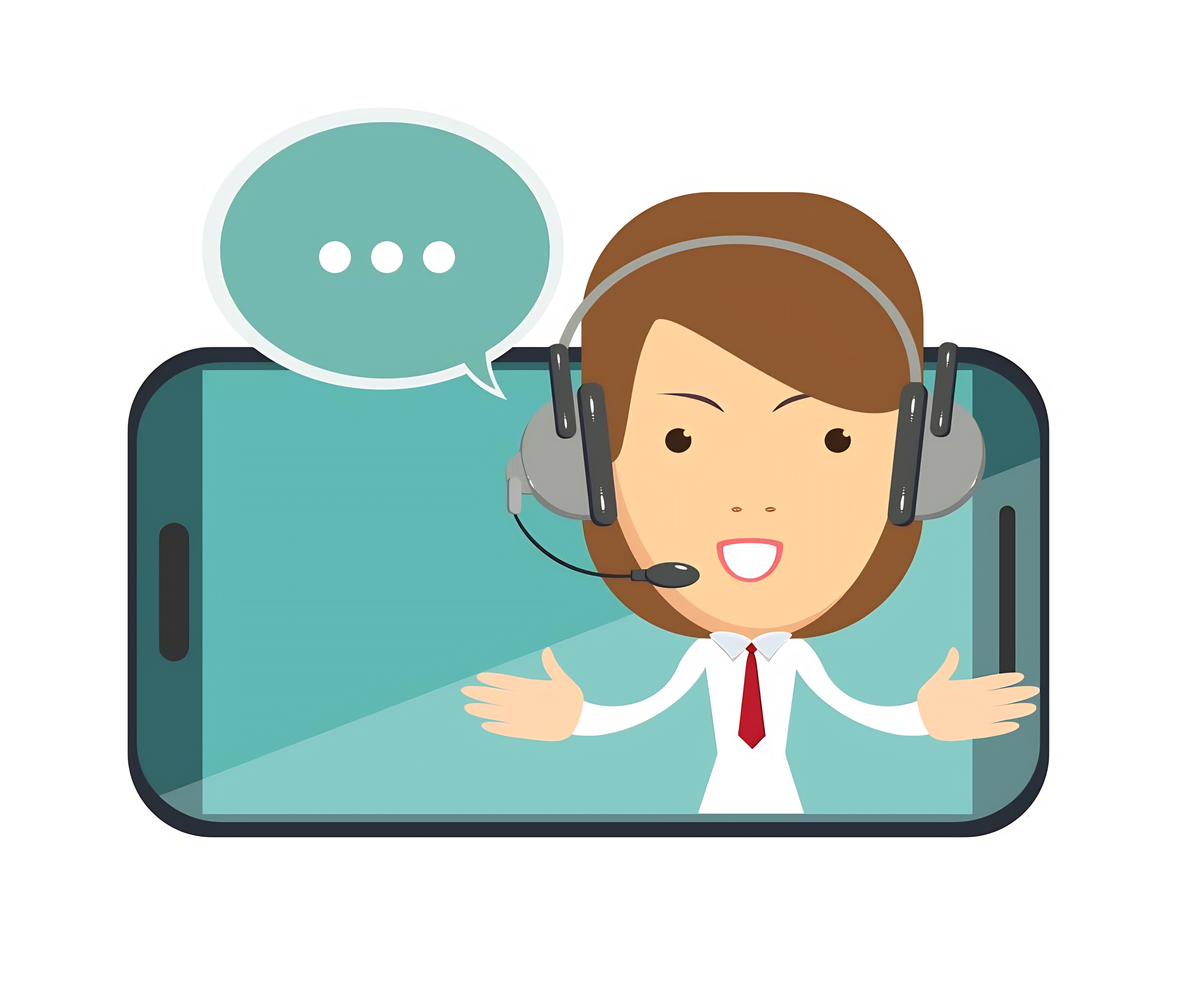 Smiling female operator with headset speaking from screen of a smart phone. Customer service concept
