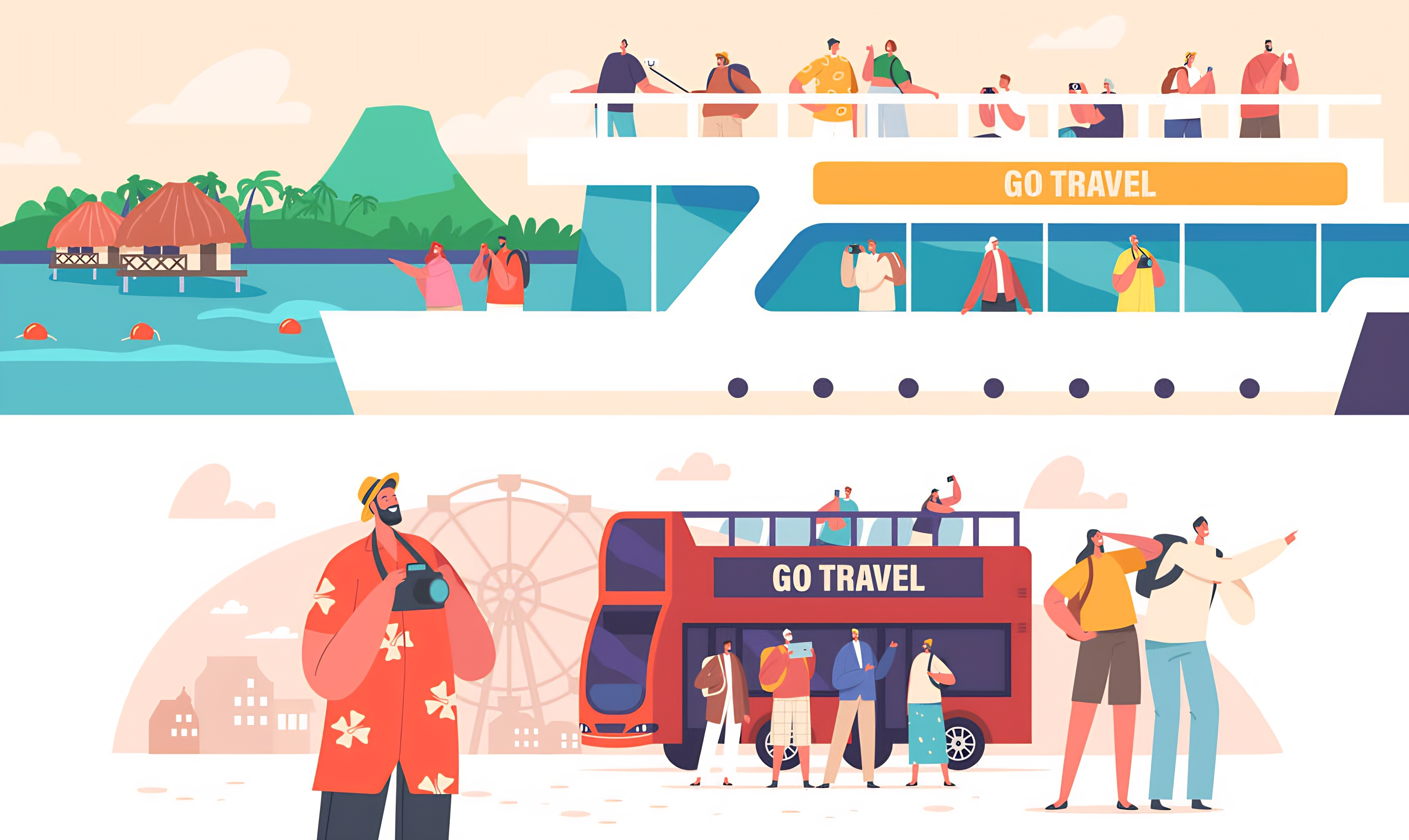 People Travel On Cruise Liner and Bus. Characters with Photo Cameras on Boat Deck With Seascape View