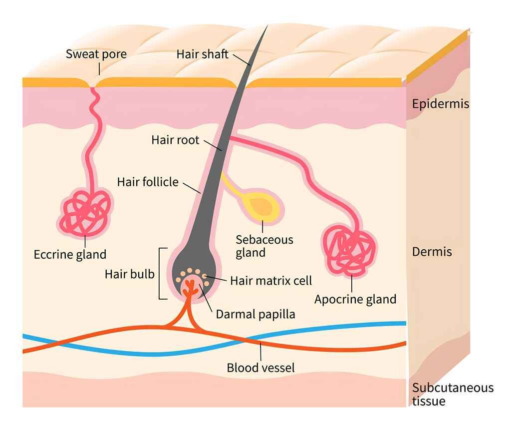 human skin layer with hair follicle, sweat and sebaceous glands. Medical, beauty, and health care use