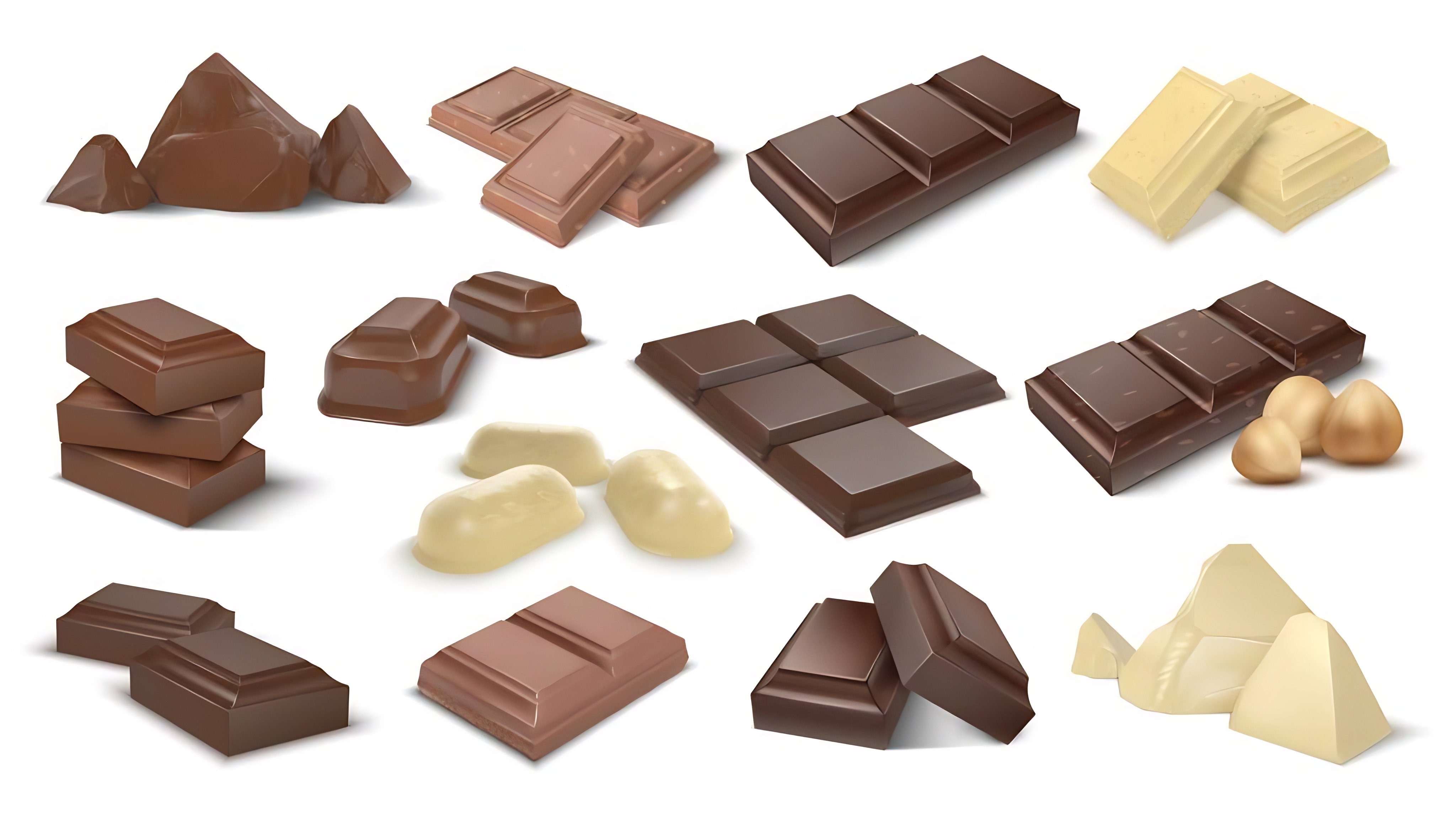 Dark and milky chocolate pieces. Realistic 3D cocoa dessert. Confectionery with nuts, sweet snack as