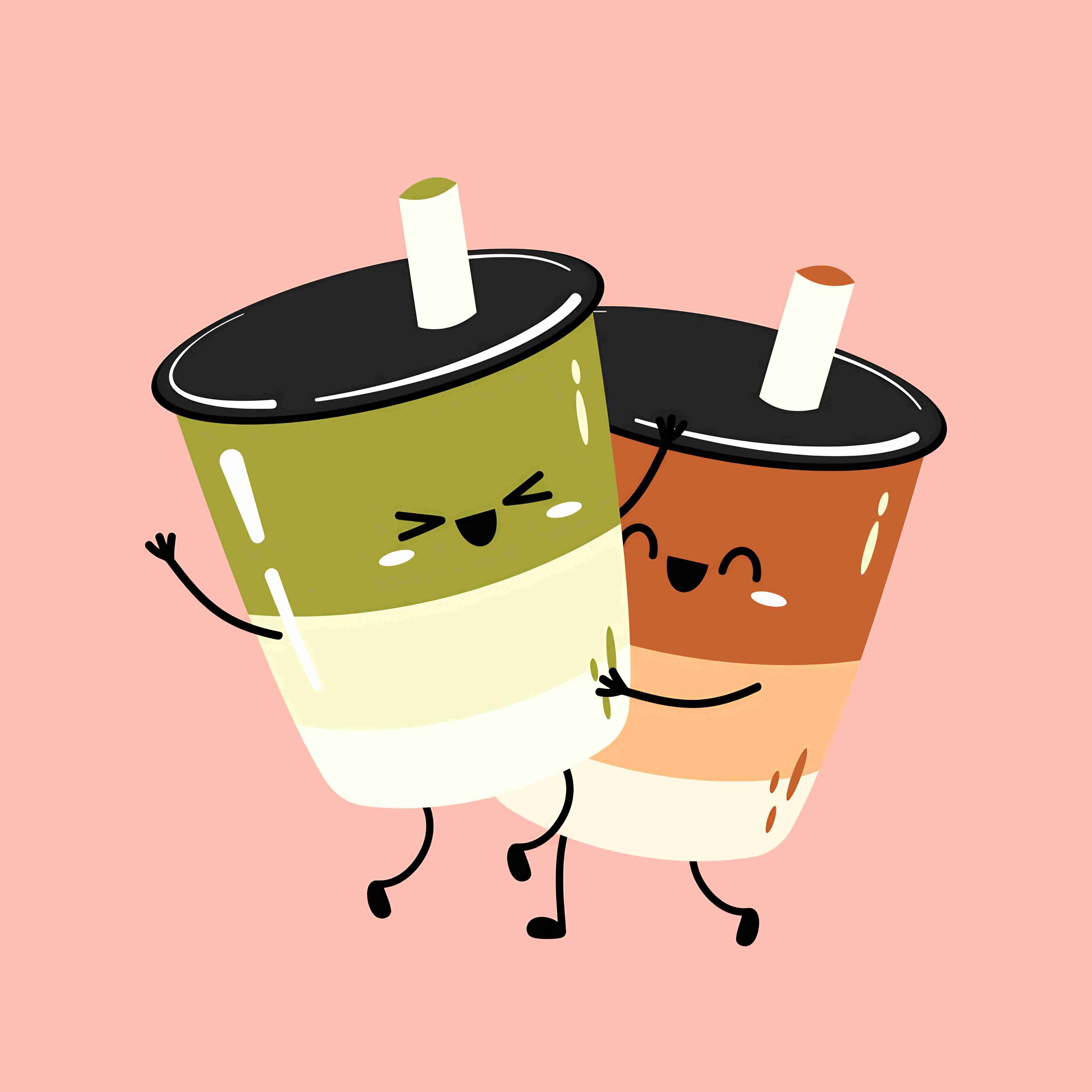 Tea cup design collection, Yummy drinks, soft drinks with doodle style banner, Milk tea ads with delicious tapioca and pearl. Milk tea character.