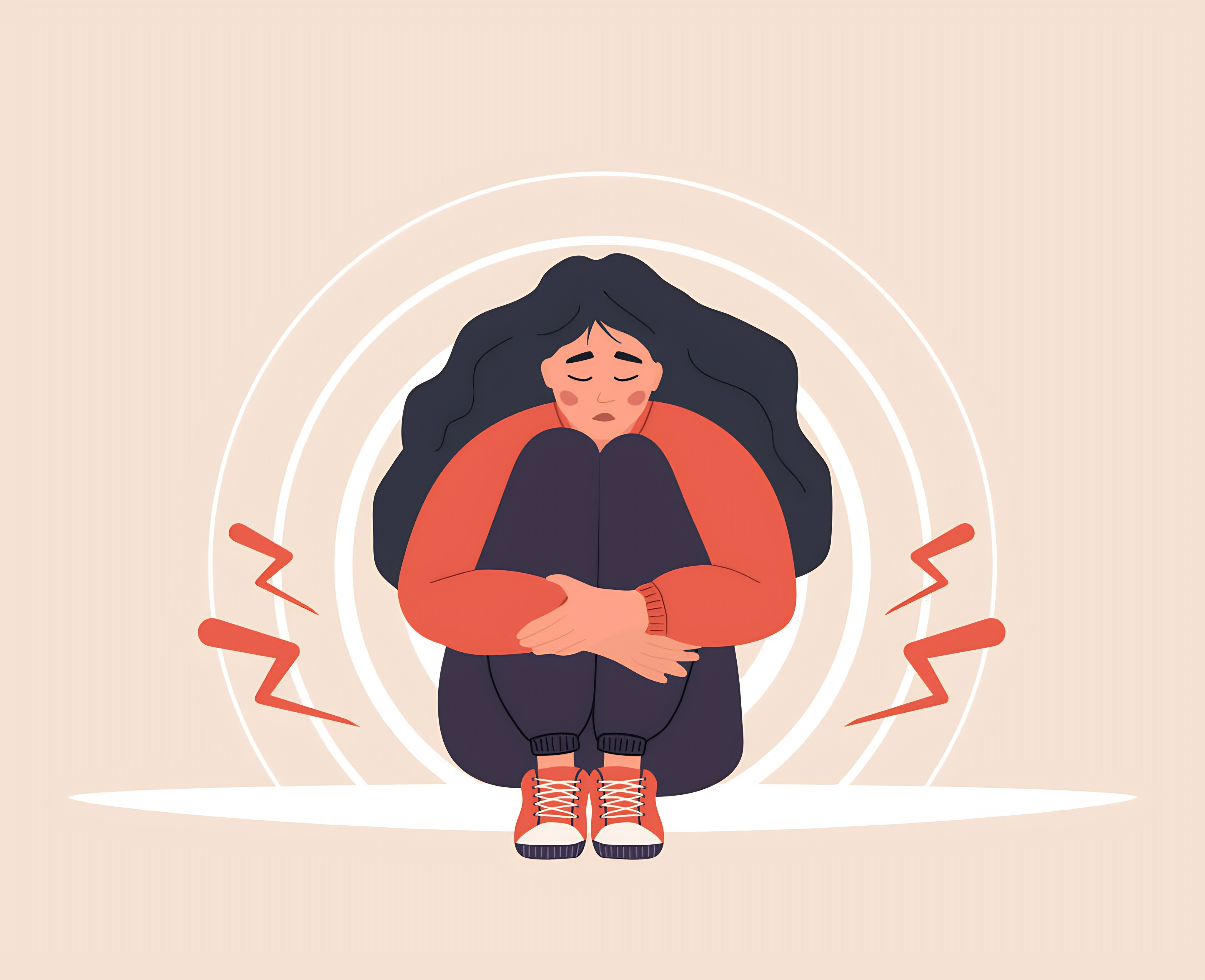 Menstrual pain. Sad woman with abdominal cramps or pms symptoms. Female critical day problems. Vector illustration in flat cartoon style