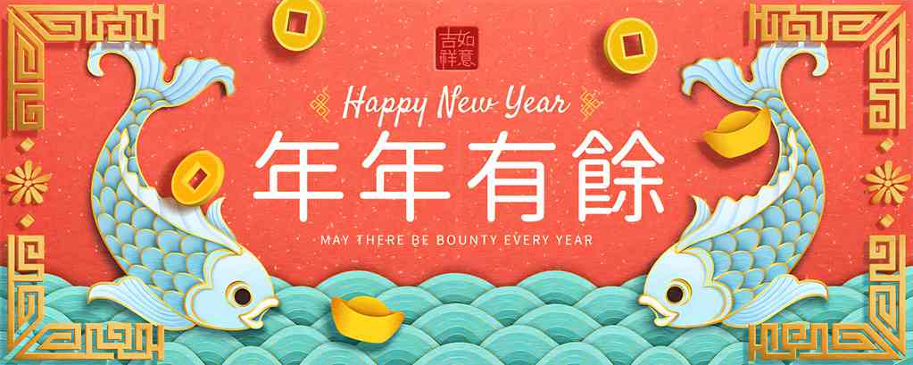 New Year design with May there be bounty every year words written in Chinese on red scroll, fish and wavy tides paper art banner