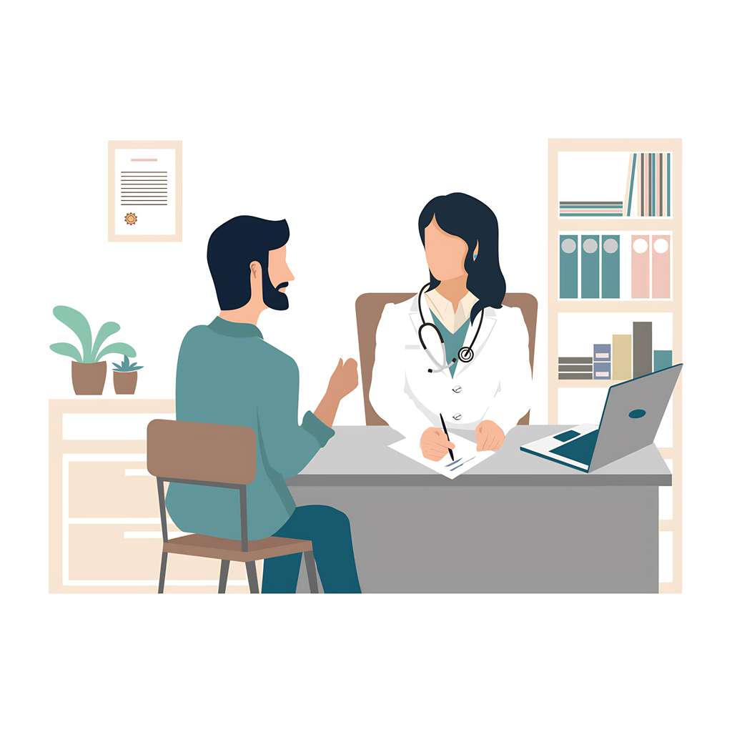 The patient and the doctor are talking in the office. Health and medicine. Flat vector illustration.