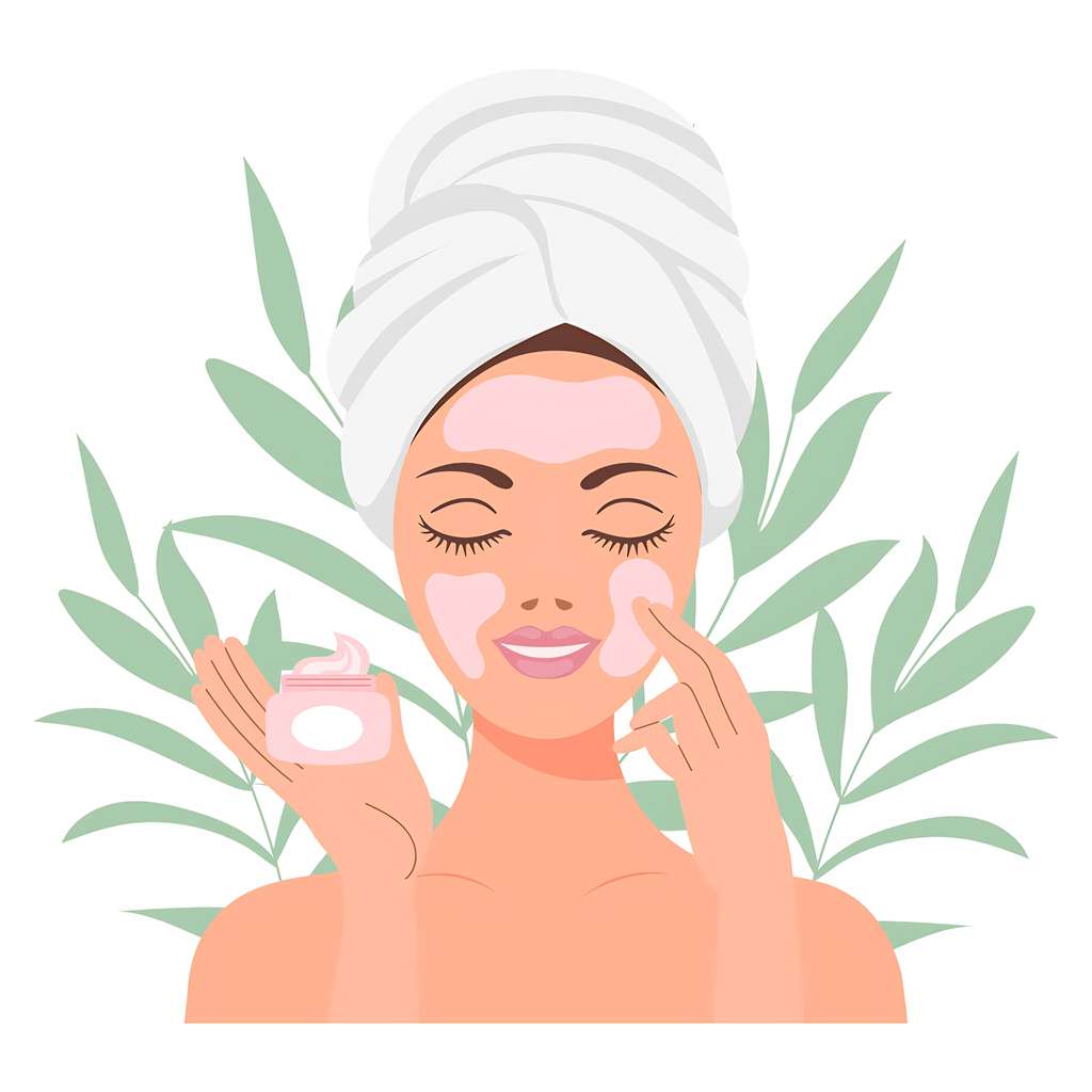 Facial skin care. A woman takes care of her skin. Cosmetic masks, patches, cream, lotion, soap, face scrub. Illustration, vector