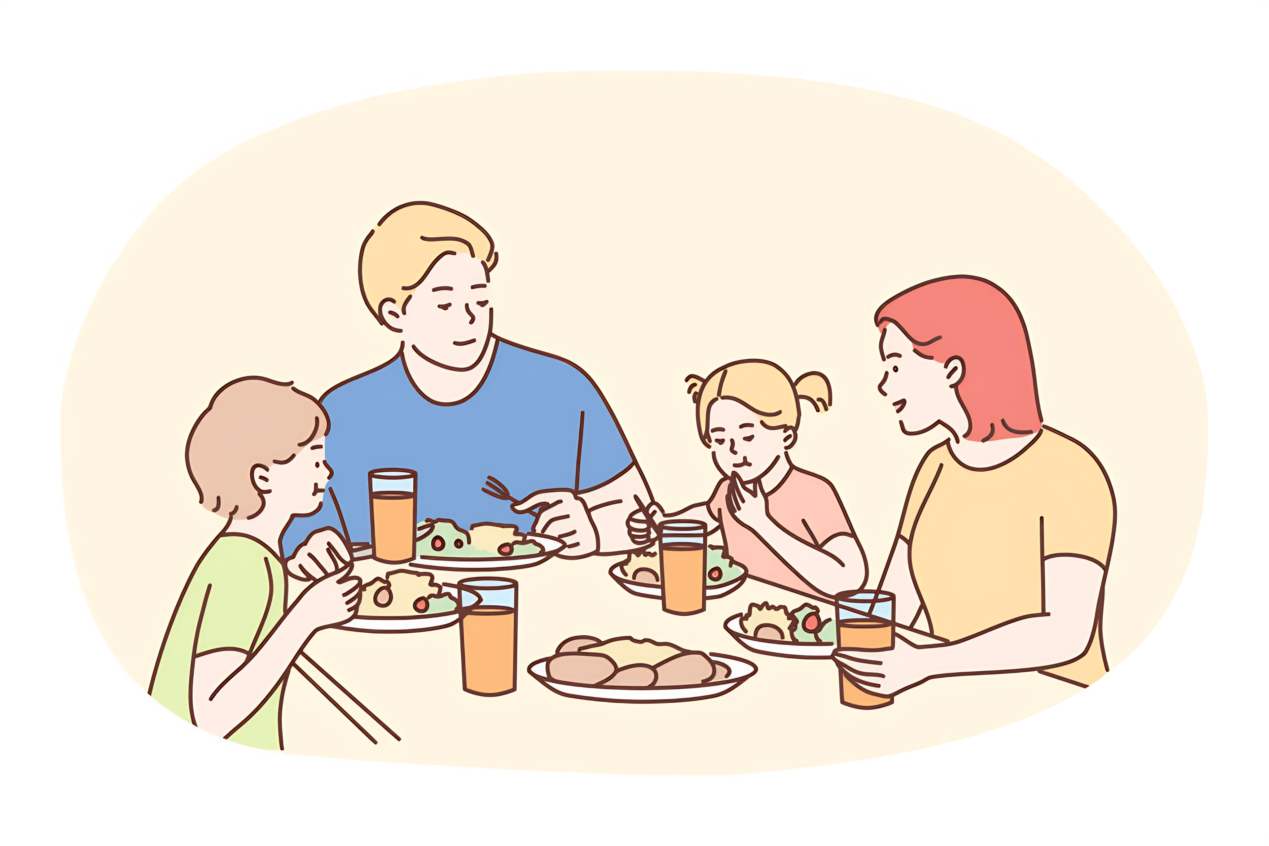 Happy family having dinner or breakfast together at home
