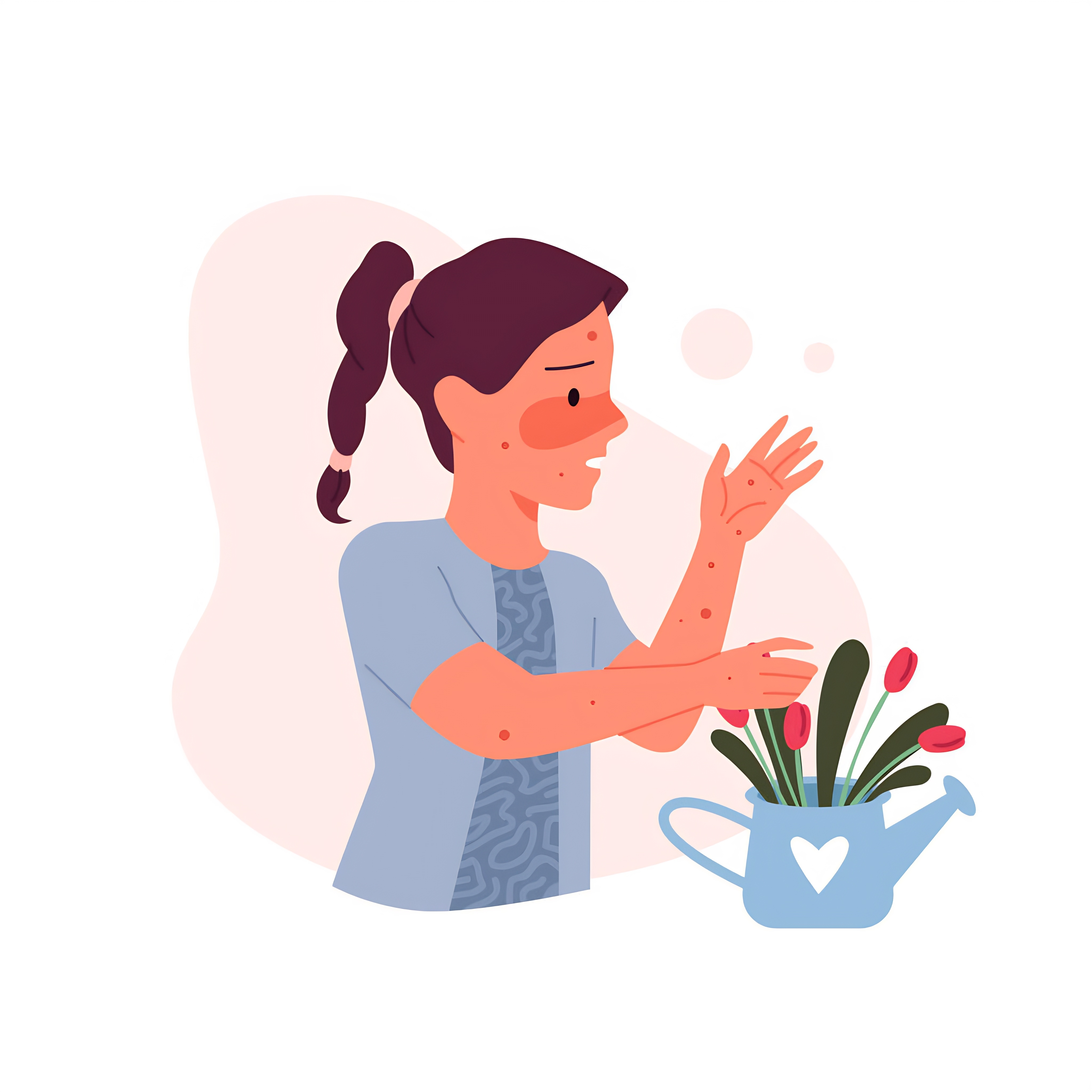 Allergic symptom to flower pollen in child, girl with rash, itchy red skin on face