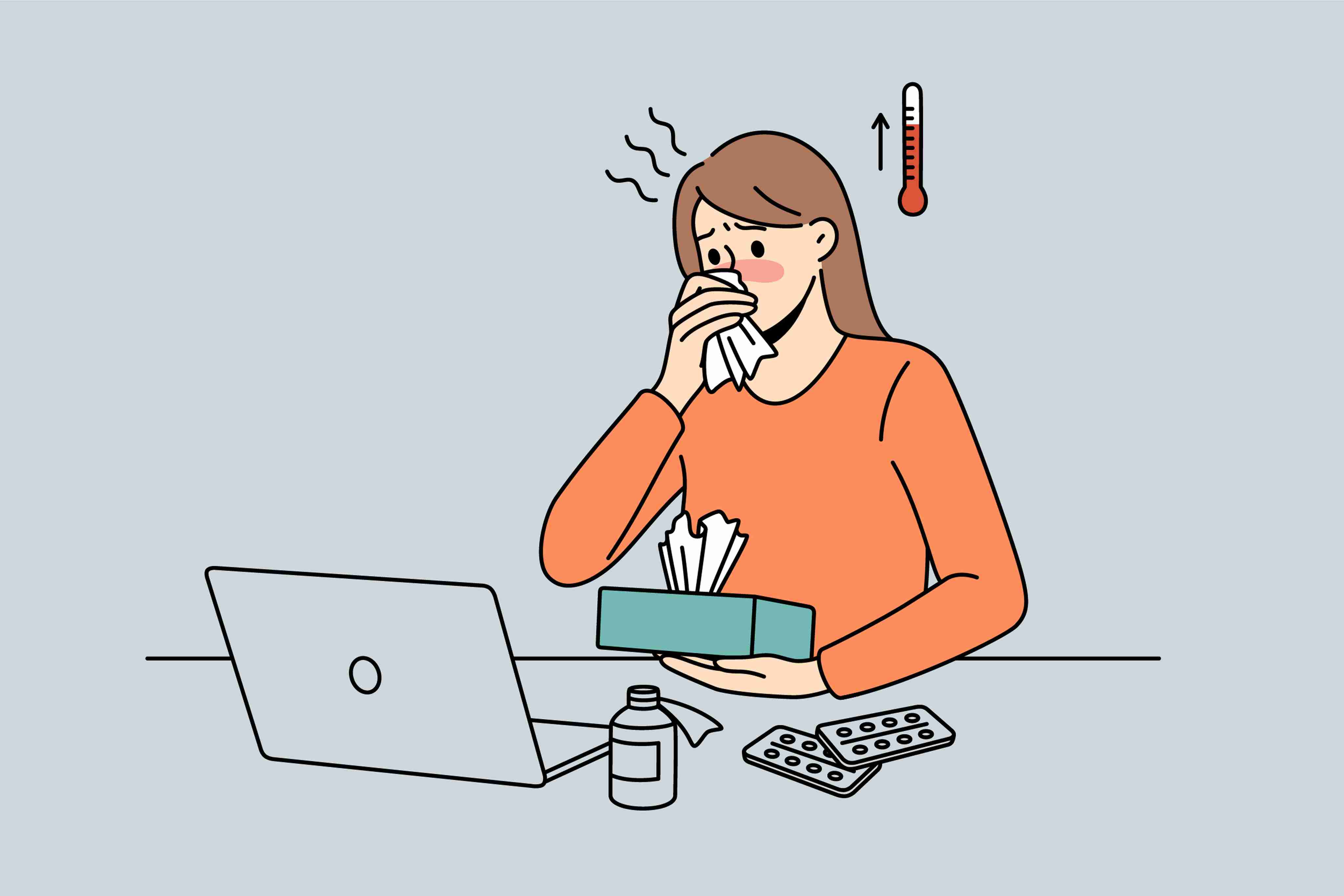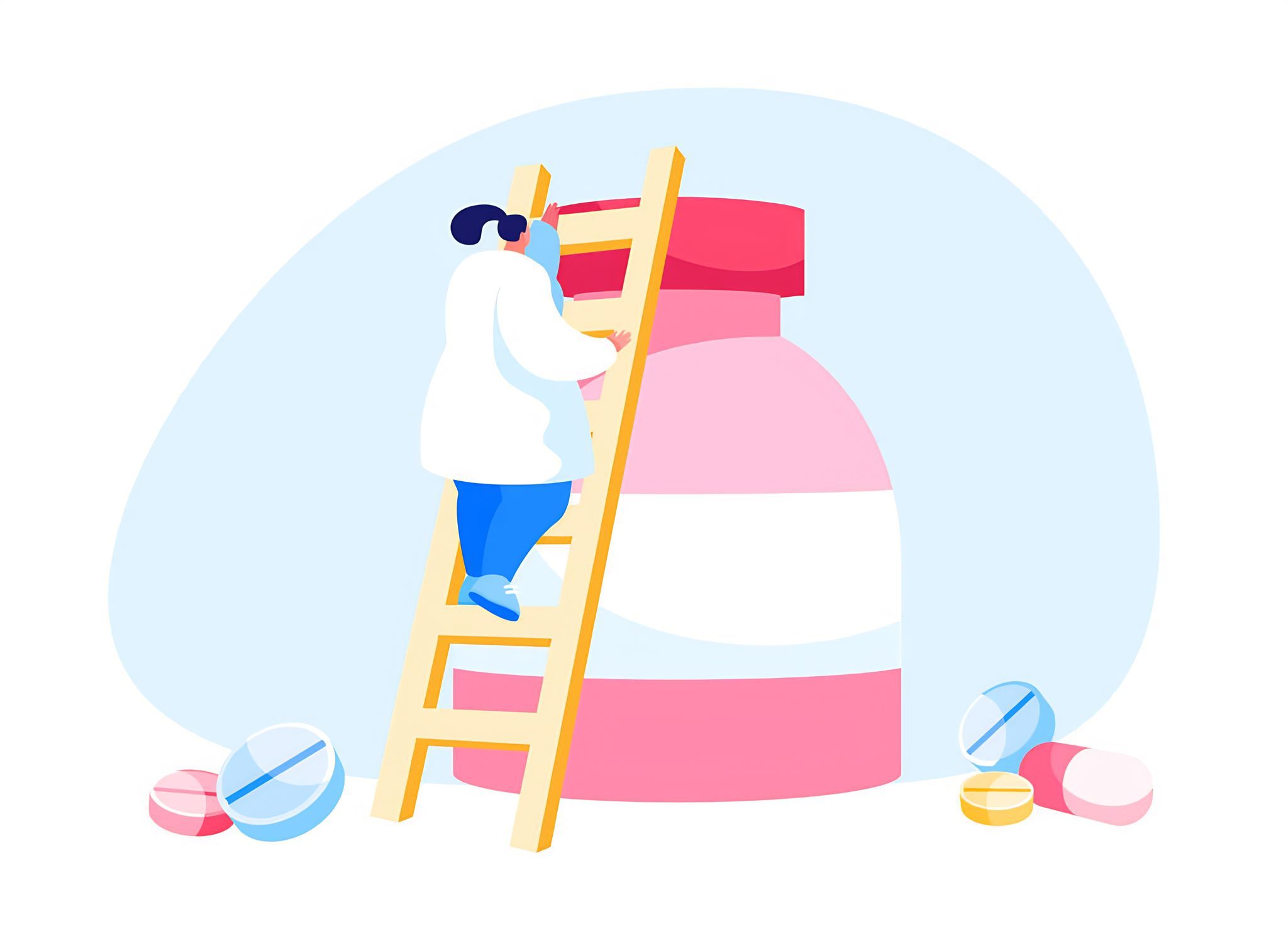 Tiny Pharmacist Female Character Climbing on Huge Medicine Bottle with Drug Pills and Tablets Scatte