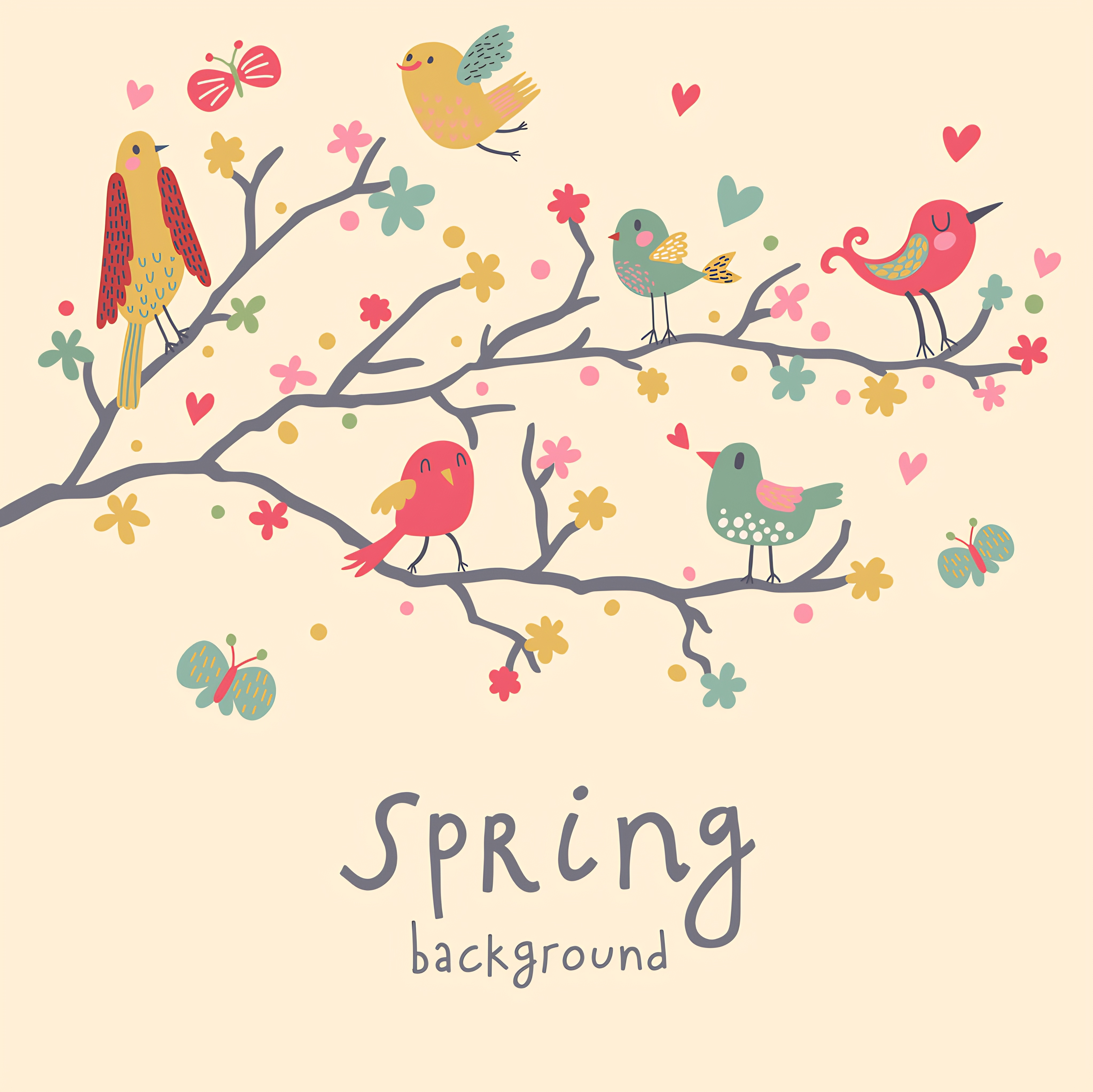 Spring background. Stylish illustration in vector. Cute birds on branches. Light romantic card. Can be used for wedding invitation.