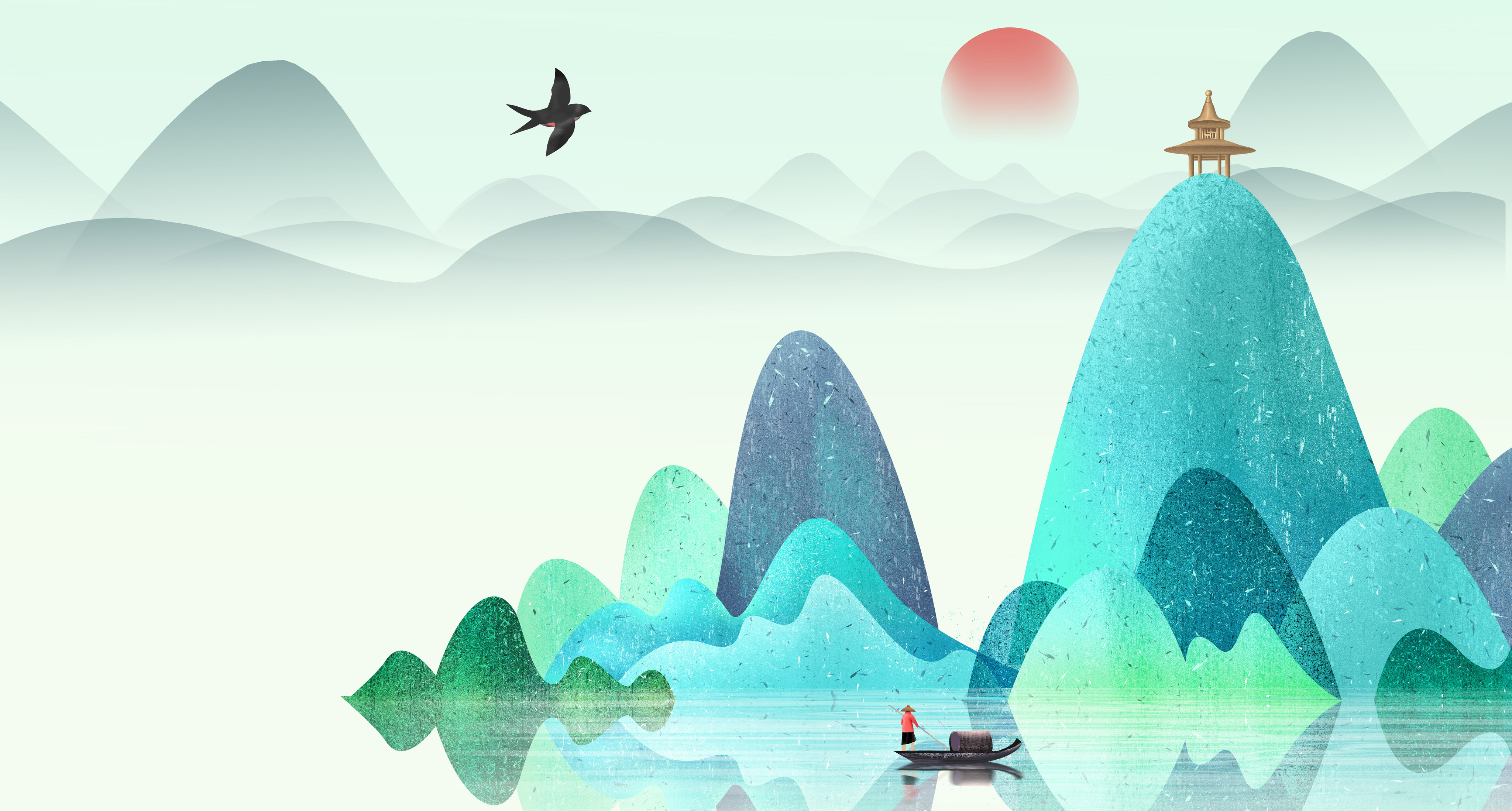 手绘春天节气小清新绿水青山背景插画