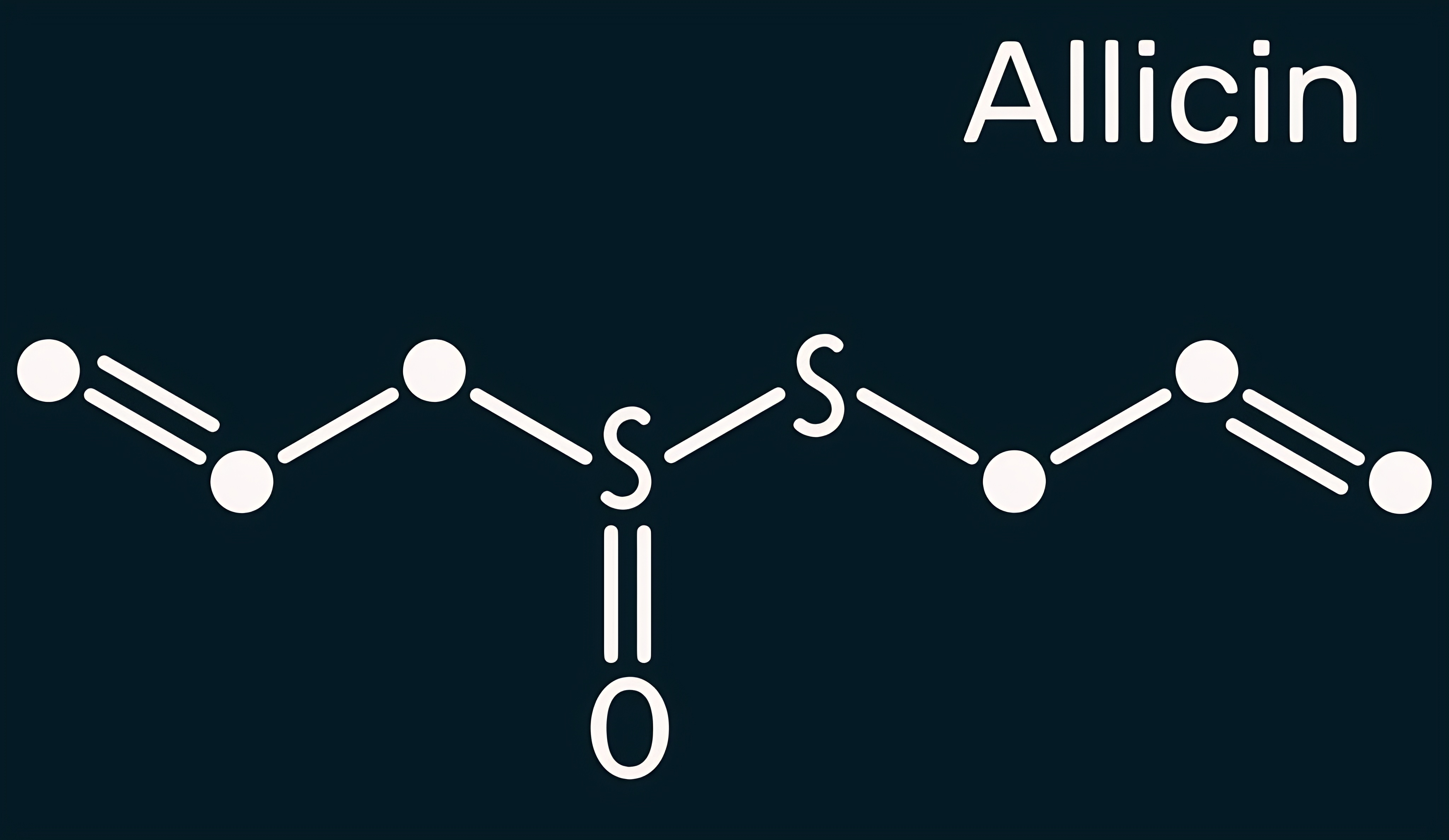 Allicin, sulfoxide molecule. This compound exhibits antibacterial and anti-fungal properties. Skeletal chemical formula on the dark blue background. Illustration
