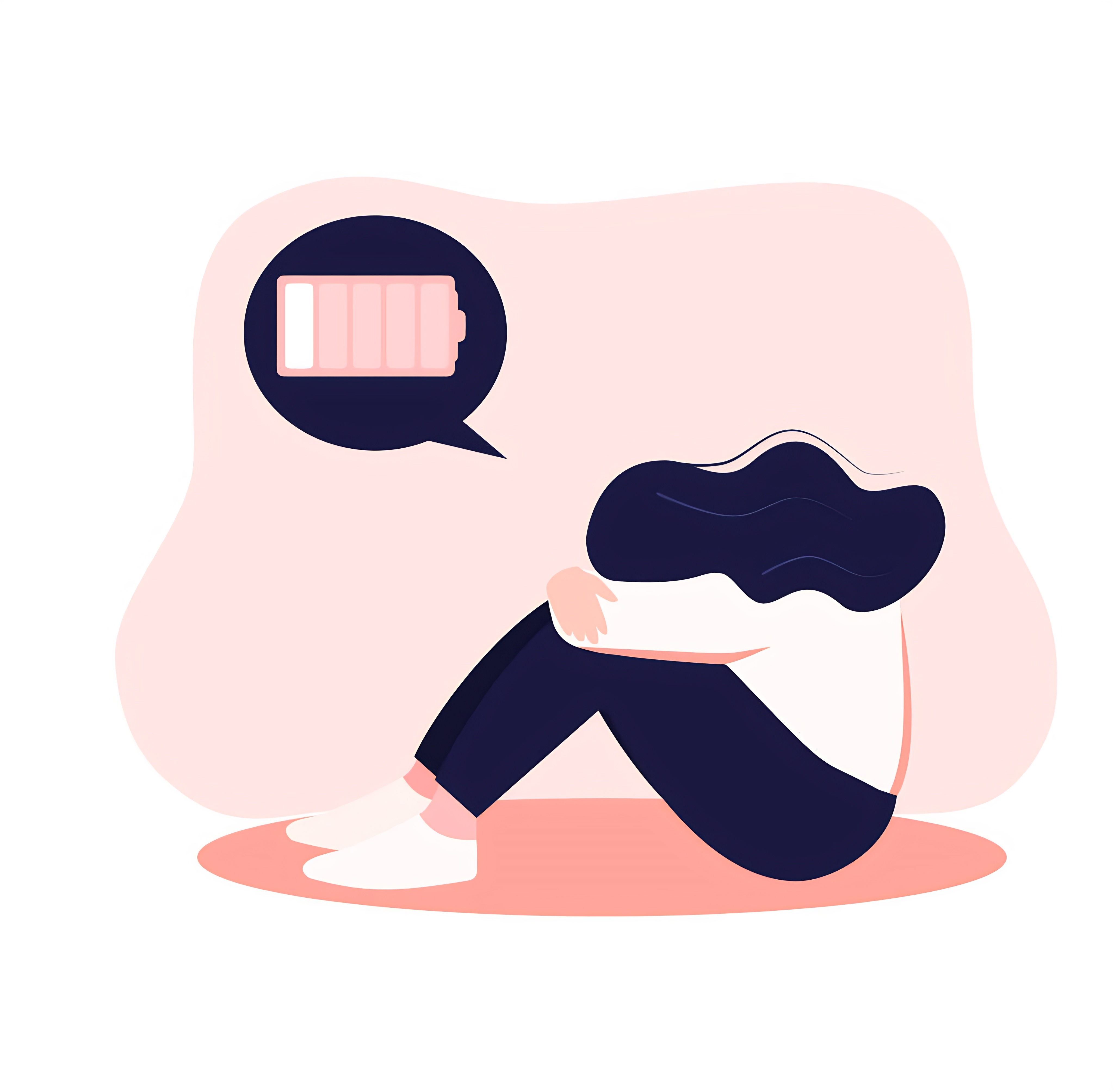 A tired woman sitting with the discharged battery in the thought. Concept of mental disorder, emotional burnout or mental depression. Flat vector. Eps 10