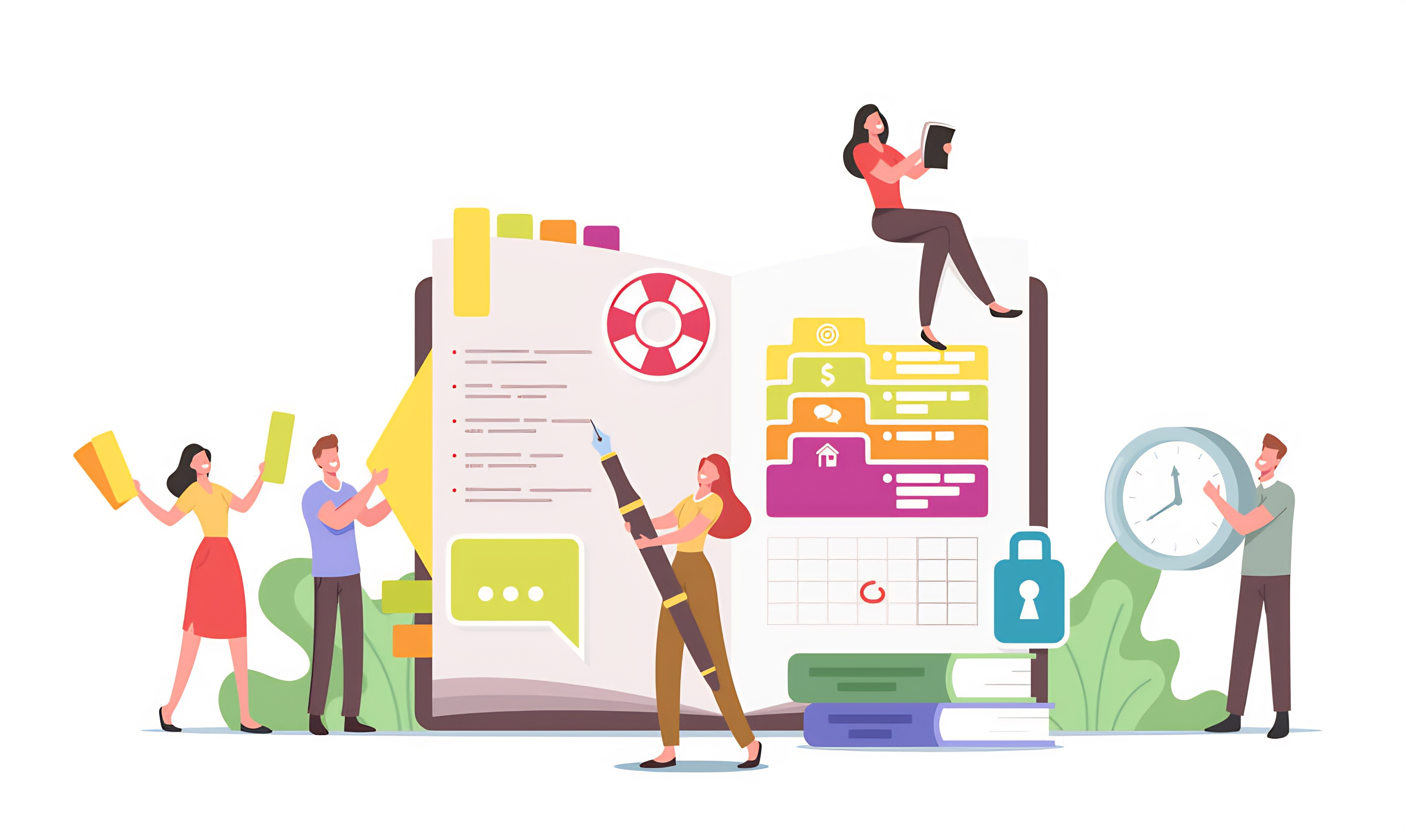 Personal Organizer Concept. Tiny Characters at Huge Diary Writing Note, Planning Deals, Filling To Do List, Put Stickers