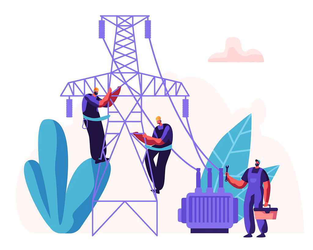 Electrician Workers Repairing Power Line. Electrical Facilities Concept with Repairman Engineer in Uniform at Wiring Maintenance Work. Vector flat illustration