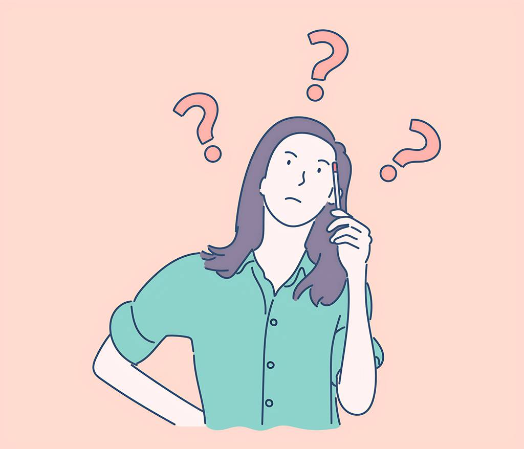 Question, brainstorm, thinking concept of dream young nice pretty cute woman or girl, indecisive lady thought choose decide dilemmas solve problems finding new ideas. Simple flat vector.